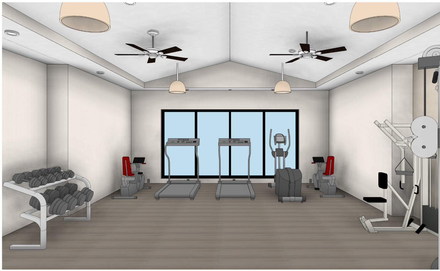 interior view of a gym with a view of a golf course with palm trees in the distance off white wallcoverings on the walls and light brown wood plank flooring white dry wall ceilings and bulkheads natural and artificial lighting