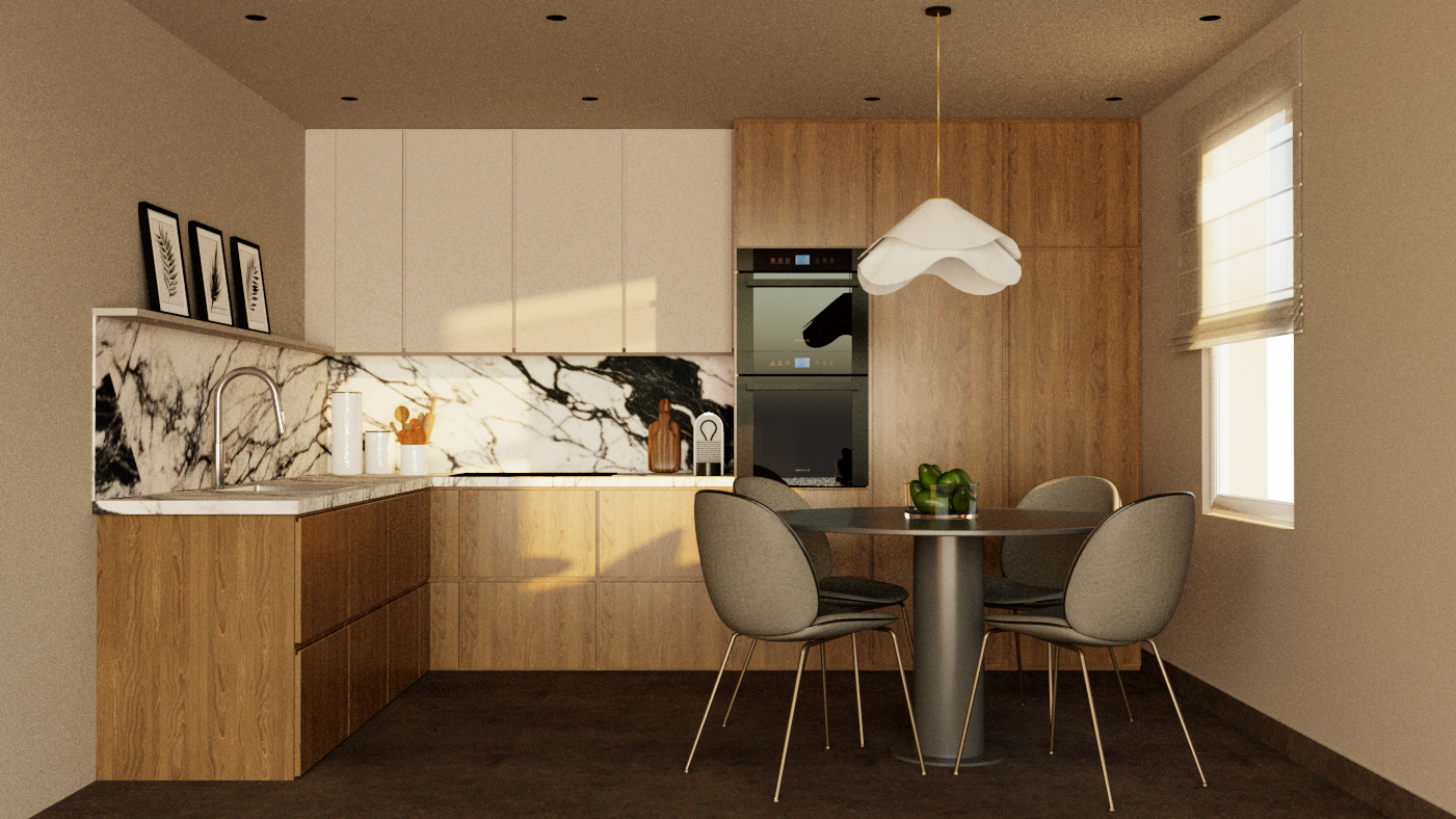 ultra realistic editorial interior render of a compact modern kitchen dining space maintaining original composition and camera framing warm late afternoon natural light entering from the right side window casting soft elongated shadows across surfaces l shaped kitchen layout lower cabinets in natural walnut wood with vertical grain highly realistic wood texture subtle tonal variation and clearly defined panel divisions integrated carved finger pulls u ero with visible depth and precise shadowing upper cabinets in matte lacquered finish cool greyish tone not beige perfectly smooth surface with no reflections the perceived warm golden tones on these cabinets must come exclusively from the sunlight not from the material color itself countertop and backsplash in porcelain marble effect matte finish with slight surface roughness realistic veining black and grey on neutral white base continuous material between horizontal and vertical planes avoiding glossy or plastic appearance walls finished in soft grey painted surface matching the image tone ultra realistic matte paint texture with subtle irregularities and natural light absorption floor in large format porcelain tiles approx 120x120 cm microcement effect rectified edges with almost invisible joints very subtle tonal variation completely matte dining area round table with central pedestal base in brushed stainless steel soft reflections slightly worn industrial finish chairs with upholstered seats in neutral fabric and thin brushed stainless steel legs matching the table and kitchen fixtures on the table a minimal fruit bowl containing pears not avocados natural color variation and organic imperfections sink and faucet in brushed stainless steel matching chair and table structure ceiling with recessed downlights lights off slightly pushed inward deep recessed effect creating soft shadow rings suspended pendant lamp above the table made of papier m ch plaster like material organic wavy shape matte off white finish zara home style softly diffusing light but not turned on window on the right with a light linen roman blind partially lowered soft fabric texture filtering sunlight decor elements minimal and realistic framed prints ceramic objects wooden accessories all with natural imperfections global lighting soft and cinematic slightly warm due to sunlight with mild atmospheric turbidity very subtle grain in air enhancing realism no changes in layout proportions or objects no added elements no stylization beyond photorealism