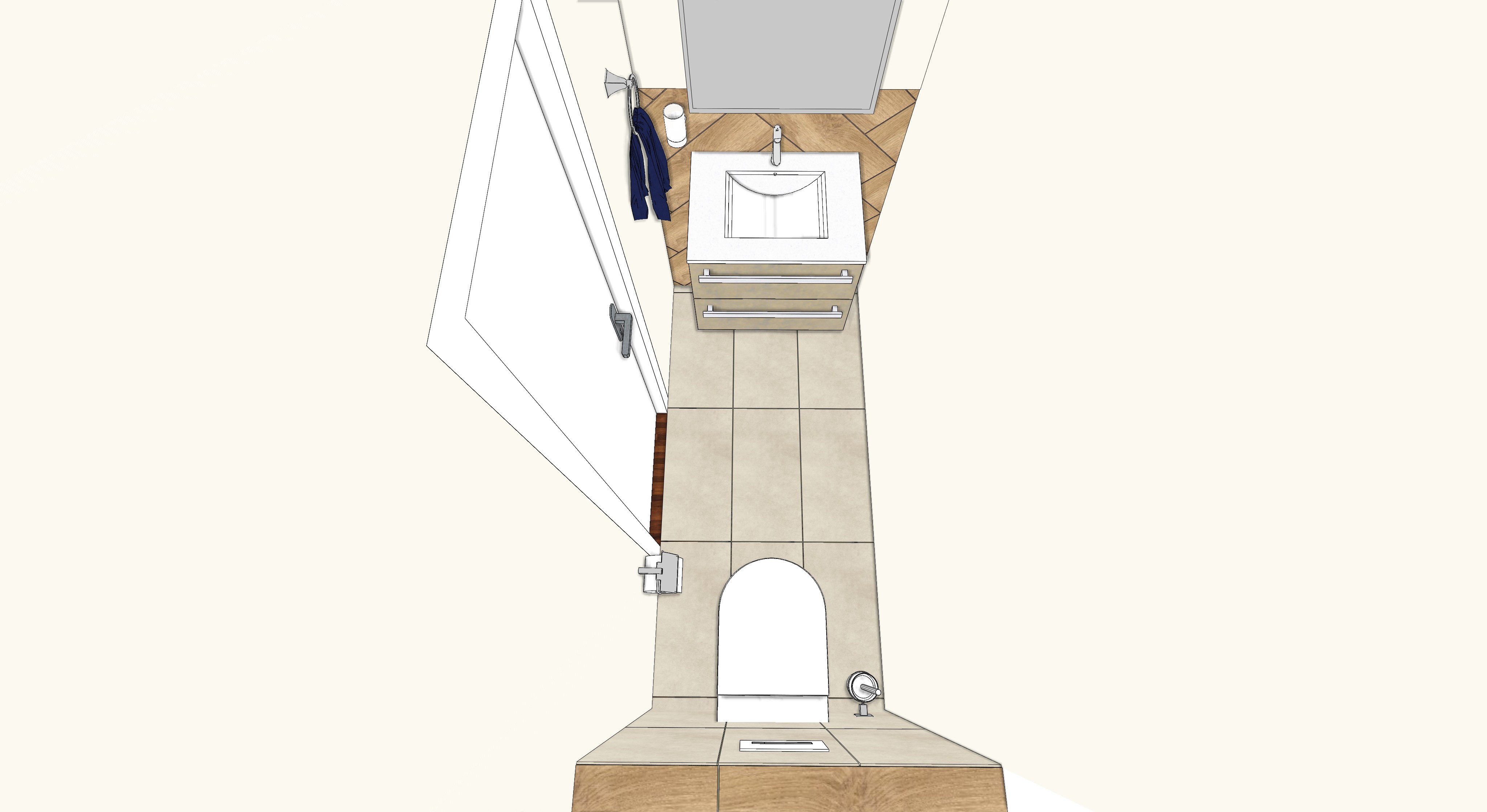 rooftop shot photorealistic render of a small modern guest bathroom based on the uploaded sketch maintain accurate geometry and proportions do not distort or stretch the space camera top down view slightly angled not fully overhead at 1 8 m height using a 24 mm lens for realistic scale design details vanity wall mounted light oak cabinet with two drawers and slim metallic handles topped with a white quartz countertop and integrated rectangular sink basin faucet modern chrome single handle design centered mirror frameless mounted above the sink with a clean reflective surface walls smooth off white paint for a bright and clean appearance flooring large light beige ceramic tiles with subtle stone texture and narrow grout lines area in front of the sink warm wood look ceramic herringbone tiles transitioning seamlessly from the hallway toilet modern wall mounted white ceramic with chrome flush button and minimal form accessories chrome toilet paper holder small towel hook with a navy towel lighting soft diffused daylight from the hallway complemented by subtle ceiling led illumination reflections and shadows realistic matching the tight space overall tone bright natural minimalist and functional with warm neutral materials and realistic lighting render in ultra realistic interior photography style 4k resolution hd ar 16 9 style photoreal lighting soft natural daylight true colors maintain proportions no distortion