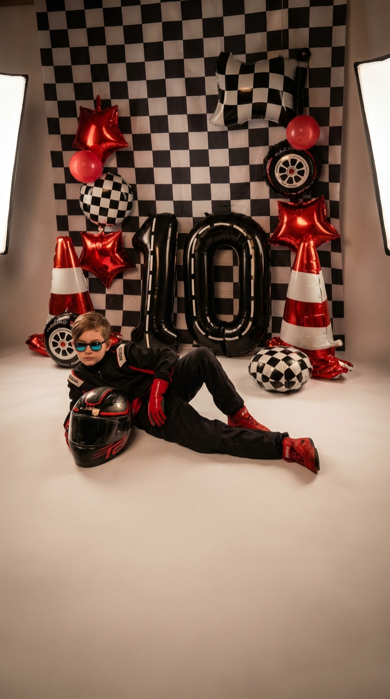 keep the exact face of the boy do not change the face do not change the face proportions do not change the glasses do not change the hair complete background on the right side of the picture with f1 photo studio elements make a professional photo studio shot
