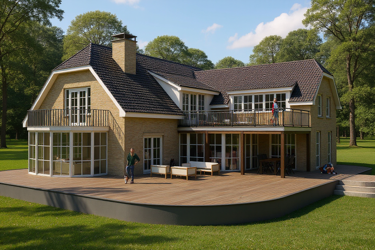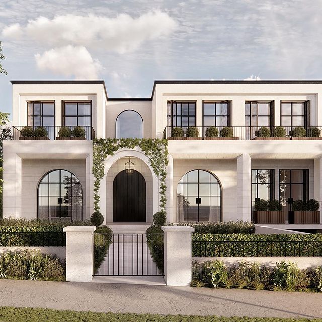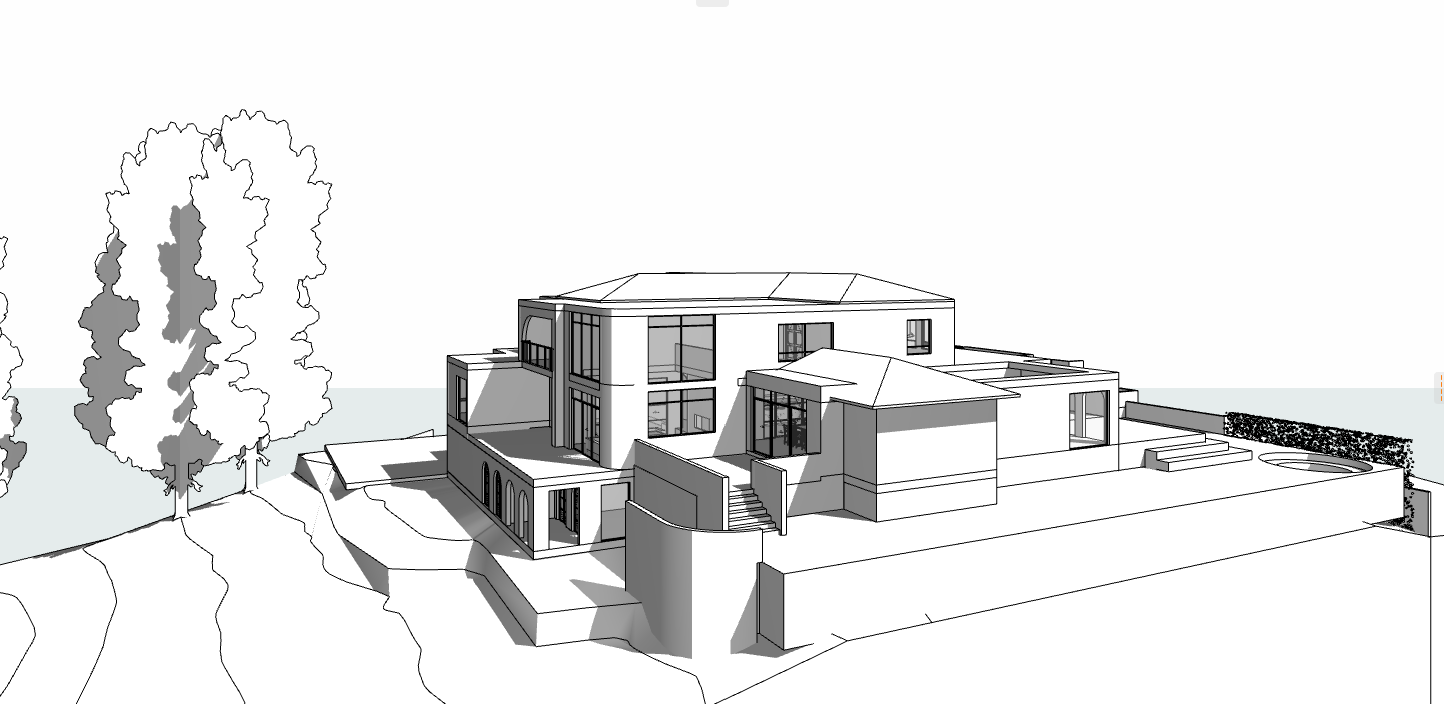 exterior shot keeping the exact design and proportions from the original render the building in a modern mediterranean style with white plaster walls black joinery glass balustrades with a simple single steel handrail and balusters include a grassy slope landscape in the foreground hills in background