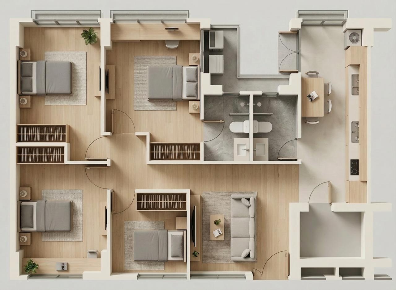 a zoom in 3d view of the master bedroom and kitchen
