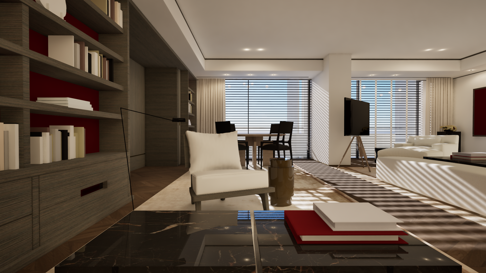 add a bit more books on the booksheve make the fabrics of the image better do not change anything else mke the lounge chair in the right back grey