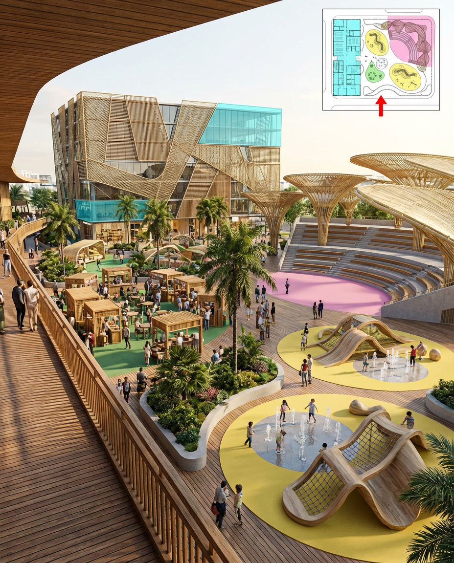 photorealistic architectural render based strictly on the provided image the project is located in nagaland india please take inspiration for the landscpae background from the images generated today and yesterday remove the small site plan image in the upper right corner completely remove the building in the background at the end of the public plaza create a street clearly separating the plaza from the landscape beyond beyond this street add a landscaped park with trees forming a green buffer and a natural continuation of the public space preserve the original camera angle perspective lighting and architectural language do not alter the design scale or geometry of the foreground buildings canopy structures or public space do not introduce new buildings urban density or new typologies