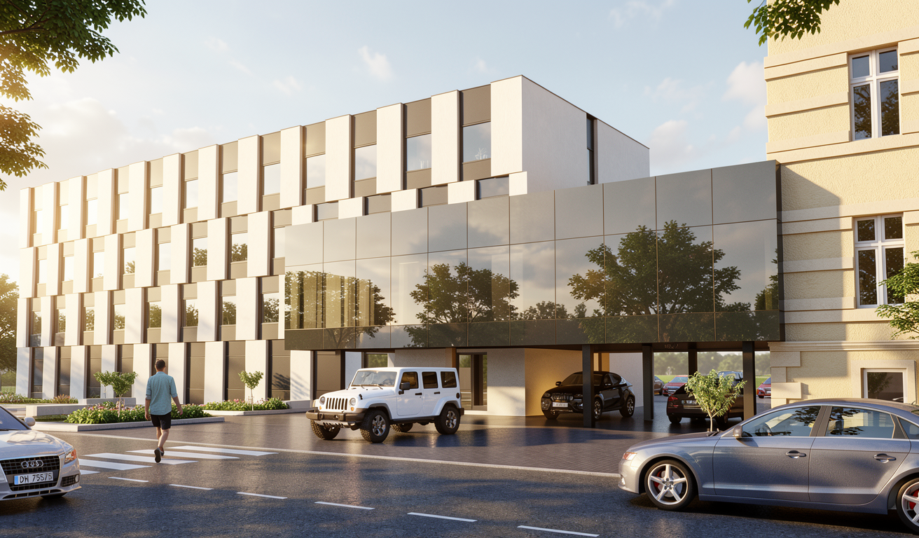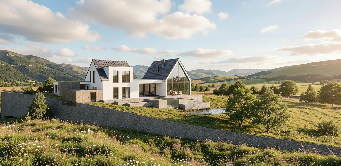 cena exterior observador esta do outro lado da rua com temos os materiais de asfalta cal ada portuguesa muro a cor branca com portao solidao e gradeamento ilimuna o natural com sol brilhando na janela de vidro sombra das arvores repleti na casa e no chao relva verde e macia vaos com vidro e caixilharias na cor preta parede a cor branco e ripado de madeira coroamento da residencia a cor preta antracite inserida no meio urbano de casas com estilo mediterraneo vegeta o sao pinheiros e larajeiras