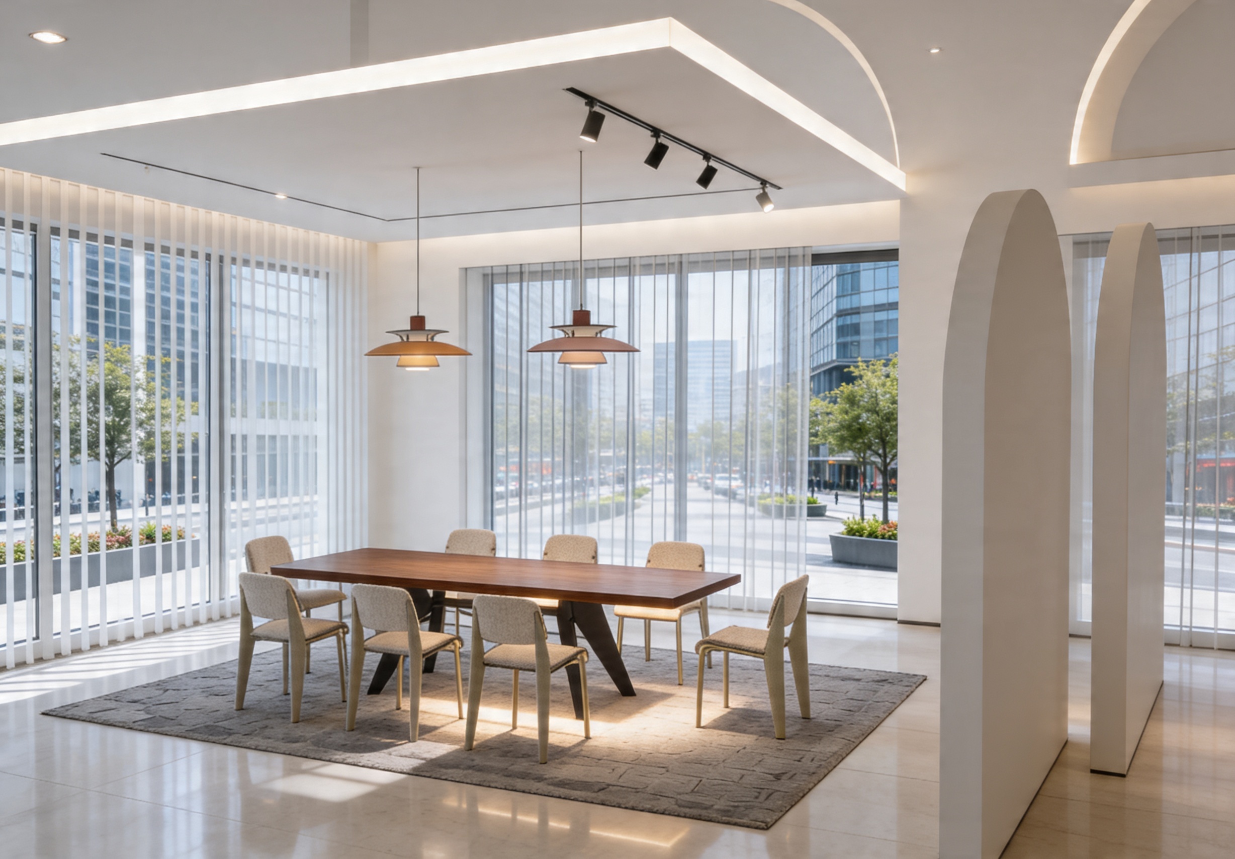 render this sketchup model into a highly realistic 3d interior visualization without changing moving or redesigning any layout geometry proportions or furniture placement ensuring the original design intent is fully preserved enhance the scene with realistic materials and textures such as walnut wood stone glass and soft textiles that feel detailed and tactile with subtle imperfections and reflections and introduce professional showroom lighting that is bright and evenly distributed with a layered approach including recessed ceiling lights and soft accent lighting to highlight key furniture pieces using warm neutral tones around 3000k 3500k with realistic shadows and light falloff improve all glazing by adding blurred exterior views of a contemporary urban cityscape with integrated greenery including trees planted streets and modern buildings with slight atmospheric depth keeping the background softened so it complements rather than competes with the interior while incorporating subtle realism elements like soft reflections global illumination and light bounce to achieve a clean curated high end furniture showroom atmosphere that feels refined inviting and photorealistic