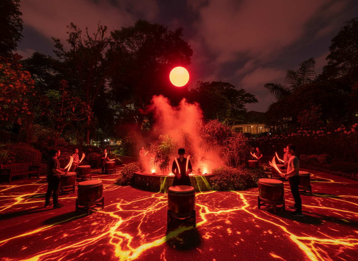 a render of a night installation at the singapore national orchid gardens a red orb sits above the fountain in the middle fountain there are lighting and fog effects that makes it look like a soft glow mist of fire standing drums are placed randomly around the fountain some of the drums have visitors standing there to beat them facing the middle the drums glow red the floor has a lava effect projected onto it