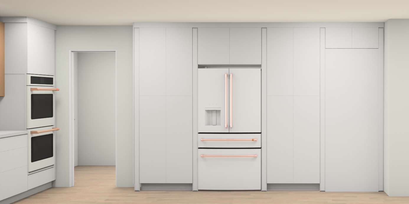 recessed lights in the ceiling the handles of all appliances are gold the walls are white