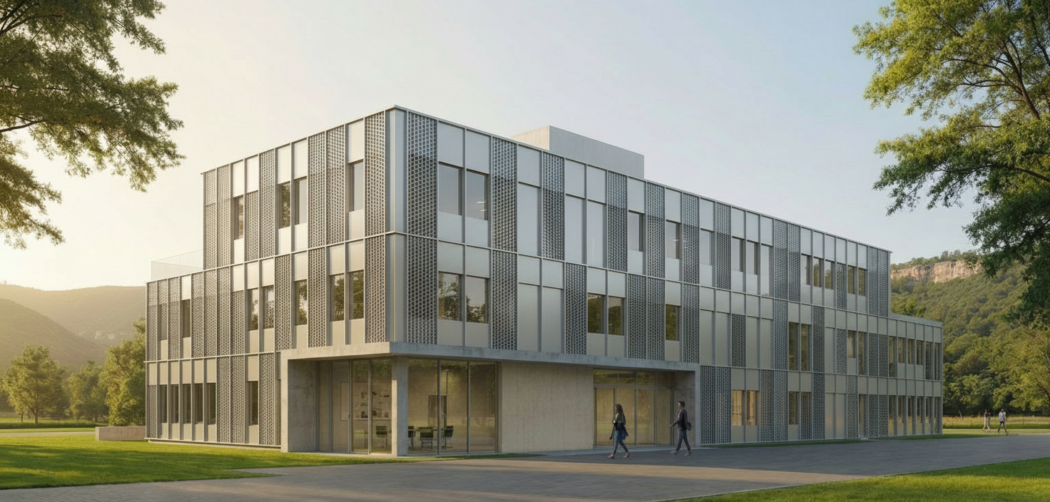 exterior shot try to apply the mood and landscape renderingstyle on the original image as an competition level rendering keep the building as it is