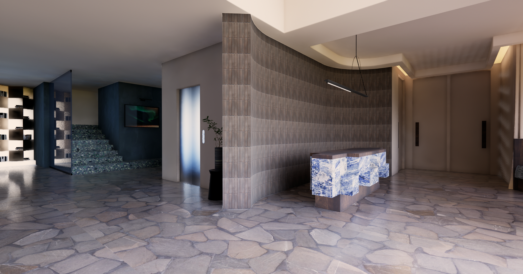 transform the provided hotel lobby interior image into a high end photorealistic render with warm golden hour atmosphere soft glowing highlights and relaxed upscale coastal energy while keeping everything exactly the same same proportions same colors and same materials and same spatial configuration do not move or alter any objects geometry textures colors or furniture positions the chairs throughout the interior must remain exactly in the same locations and proportions but their materials should read realistically the furniture should appear upholstered with subtle natural sheen and cushioned tactile texture the add premium decor objects including wine glasses luggages and phones on tables include modern young guests seated at the furniture casually social correctly scaled tastefully integrated without crowding or obstructing architectural details the shelving should shelving should feature warm and bright accent lighting enhancing reflections lighting should emphasize golden hour warmth gentle reflections soft shadows enhanced color richness and luxurious catalog level realism improve depth and realism through wood grain richness marble shine brass highlights fabric texture and polished clarity while keeping the entire scene exactly as originally designed