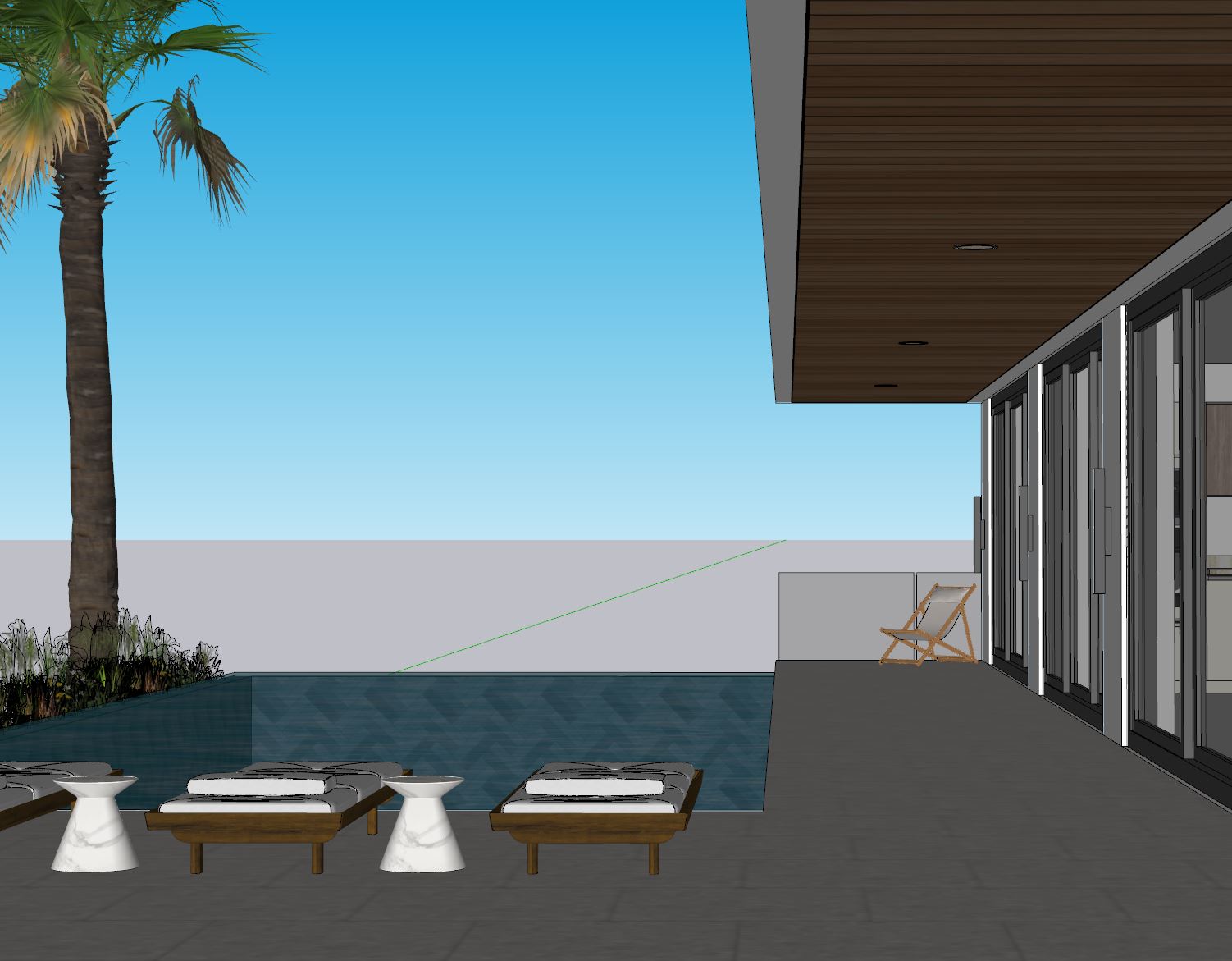 create a hyper realistic render of a modern luxury house built on top of a cliff featuring an infinity pool that visually merges with the ocean horizon match the exact camera angle and composition from the reference image use warm daylight with clear skies and subtle soft shadows the left side of the scene should show natural cliff vegetation with wild grasses and coastal plants blending into the rocky slope the pool water must have realistic reflections and gentle movement highlight the contemporary architecture with clean lines large glass sliding doors and a wooden ceiling with recessed lighting keep the outdoor loungers side tables and the chair in the background all with natural materials and soft textures emphasize the sense of elevation and openness toward the ocean achieving an elegant calm and coastal atmosphere with high end photorealism