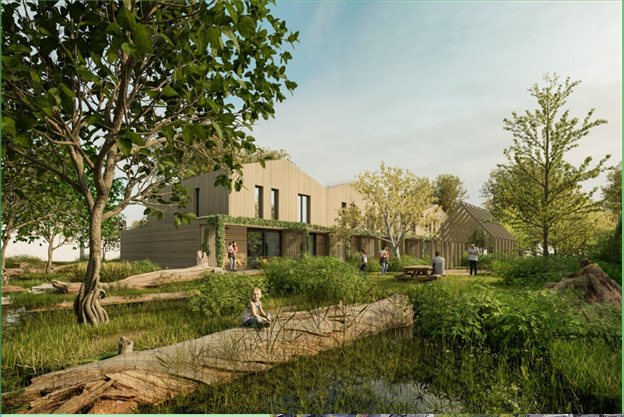 an small ecological green housing project built with lots of wood the surrounding is green with lots of trees the roofs of the houses are filled with grass flowers and bushes there are many people in the scene and the weather is sunny with a few clouds in the sky architecture architecture