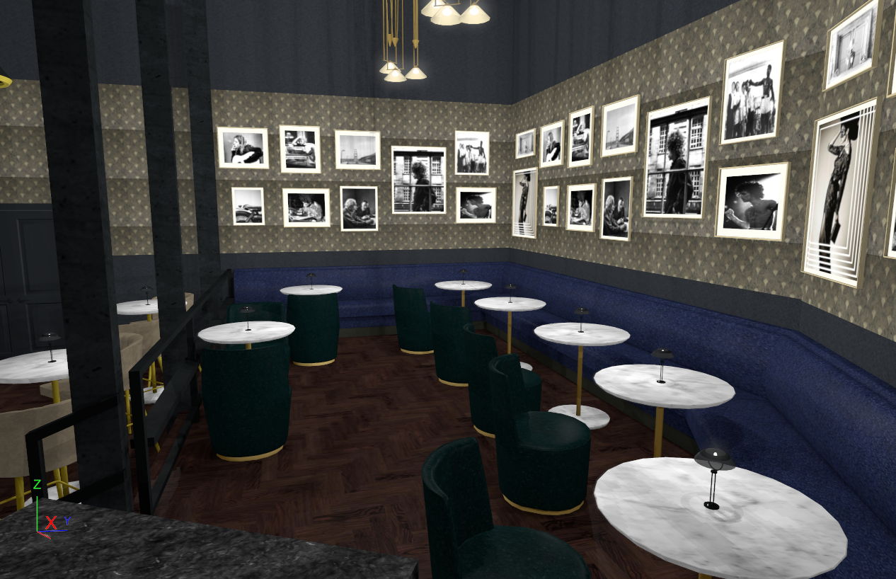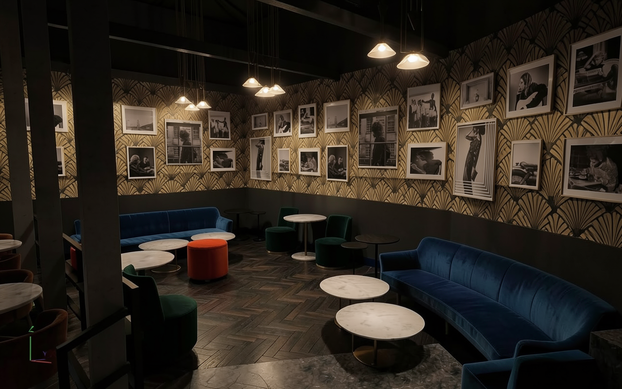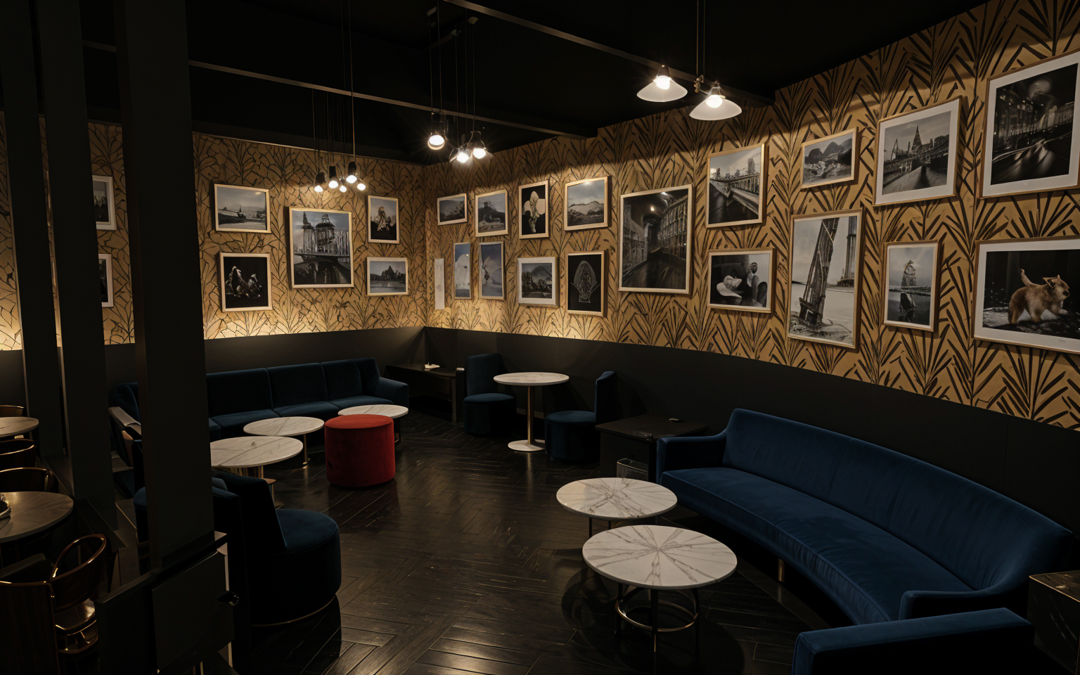 create a moody lounge with dim lighting a long velvet blue booth and green velvet chairs provided luxurious seating wall are adorned with black art deco inspired wallpaper with small gold fans the floor are dark herringbone pattern lighting from above creating a soft and alluring mood the tables are marble top with brass bases the walls are also filled with classic black and white photography