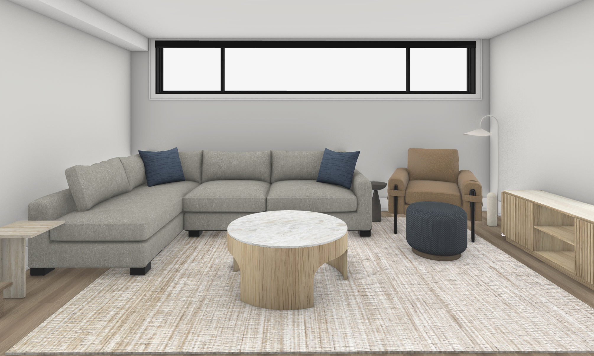natural lighting light wood tones add a background with top of the trees showing add a tv above media unit and add accessories to coffee table and shelves and small side table add a thin 1 4 thick white travertine top to media unit