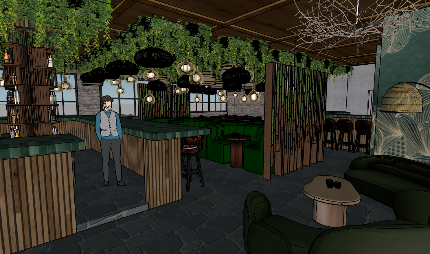 generate a photorealistic render of the restaurant s interior preserving the original layout and all furniture placement set the ceiling spotlight pendants to a low ambient glow dim but not too dark to create a warm inviting atmosphere
