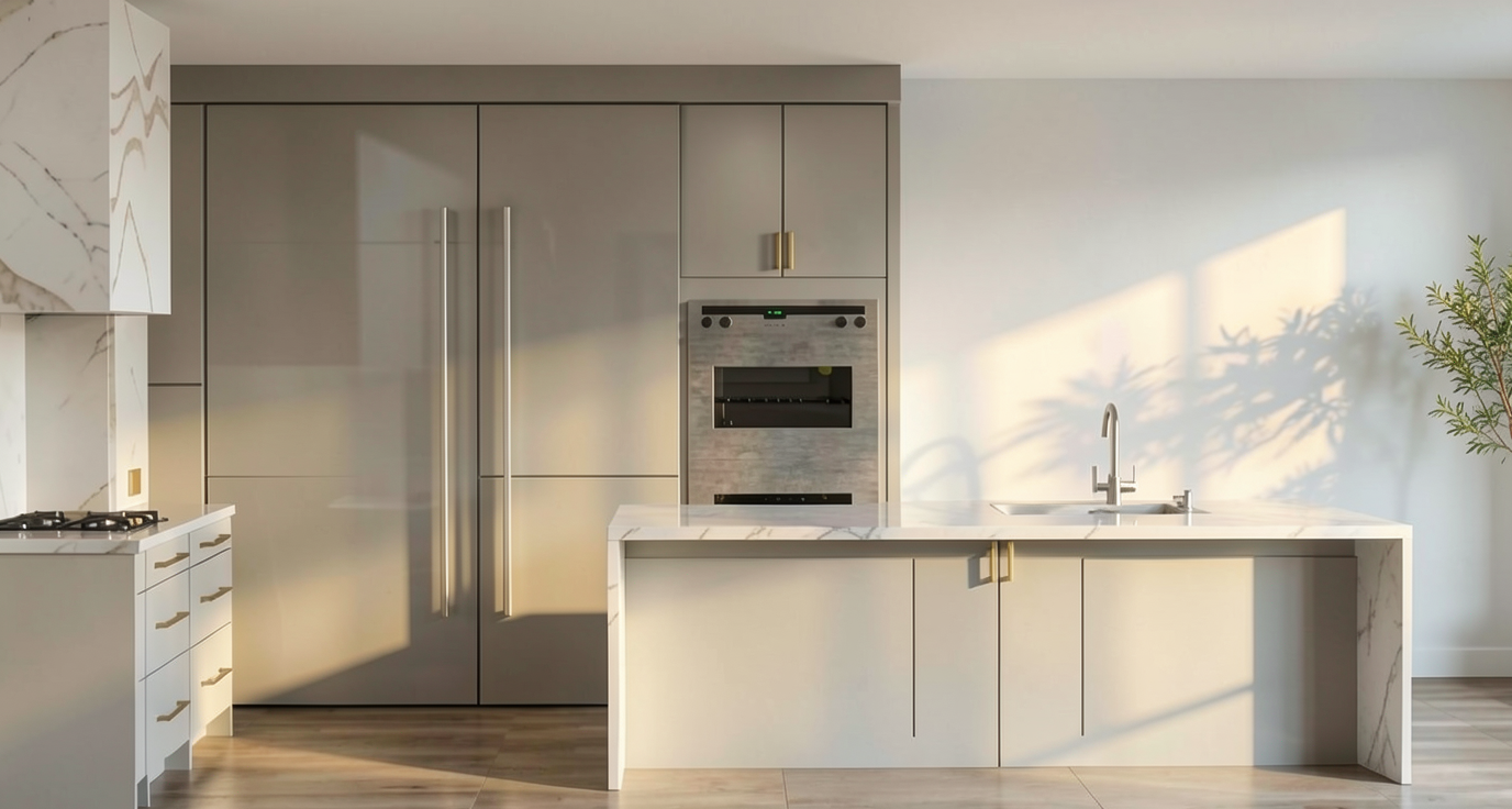 keep everything the same only change the oven hood and backsplash to be a light gray limewashed material