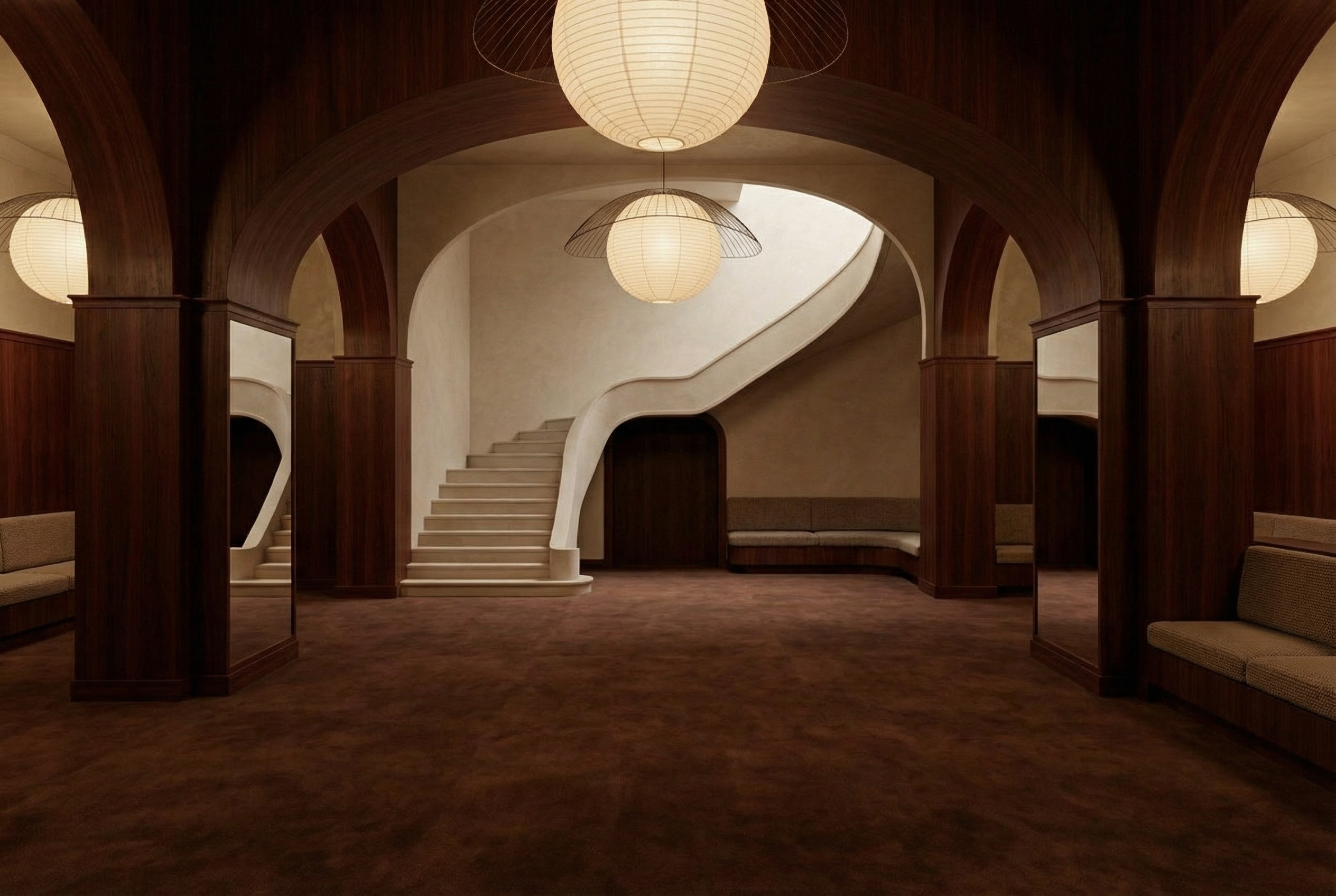 photorealistic enhancement of the main front fa ade and vehicle access area of the residential building shown in the reference image maintain the existing modern architecture volumes railings stairs and layout the scene represents the car access to the homes on the right side keep the vehicle driveway corridor completely clear functional and unobstructed with no vegetation furniture planters or decorative elements interfering with car circulation on the left side preserve the open air carport outdoor garage area also fully free of obstacles and suitable for parking vehicles comfortably behind the open air garage redesign the private garden area with lush mediterranean vegetation typical of the valencian community adapted to a mild semi tropical climate where temperatures do not drop below 10 c use shrubs ornamental plants small trees and climbing plants such as bougainvillea jasmine or similar mediterranean species to create a dense green backdrop visible from the access area vegetation must remain strictly confined to the garden area not invading the driveway or garage clean minimal and functional access zones contrasted with rich natural greenery in the background balanced natural daylight realistic materials and textures soft shadows high resolution professional architectural photography style modern mediterranean aesthetic