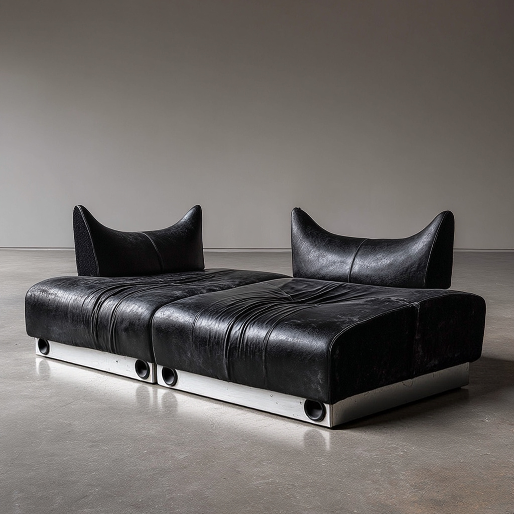 interior shot a sofa made from thick black nappa leather with a stainless steel base with integrated speakers designed in the style of mcmaster the backrests are shaped like an elongated manta rays with two small wings the sofa has four seats photographed in a studio with concrete floors and grey concrete walls cinematic feel photographed with a hasselblad h6d 400c
