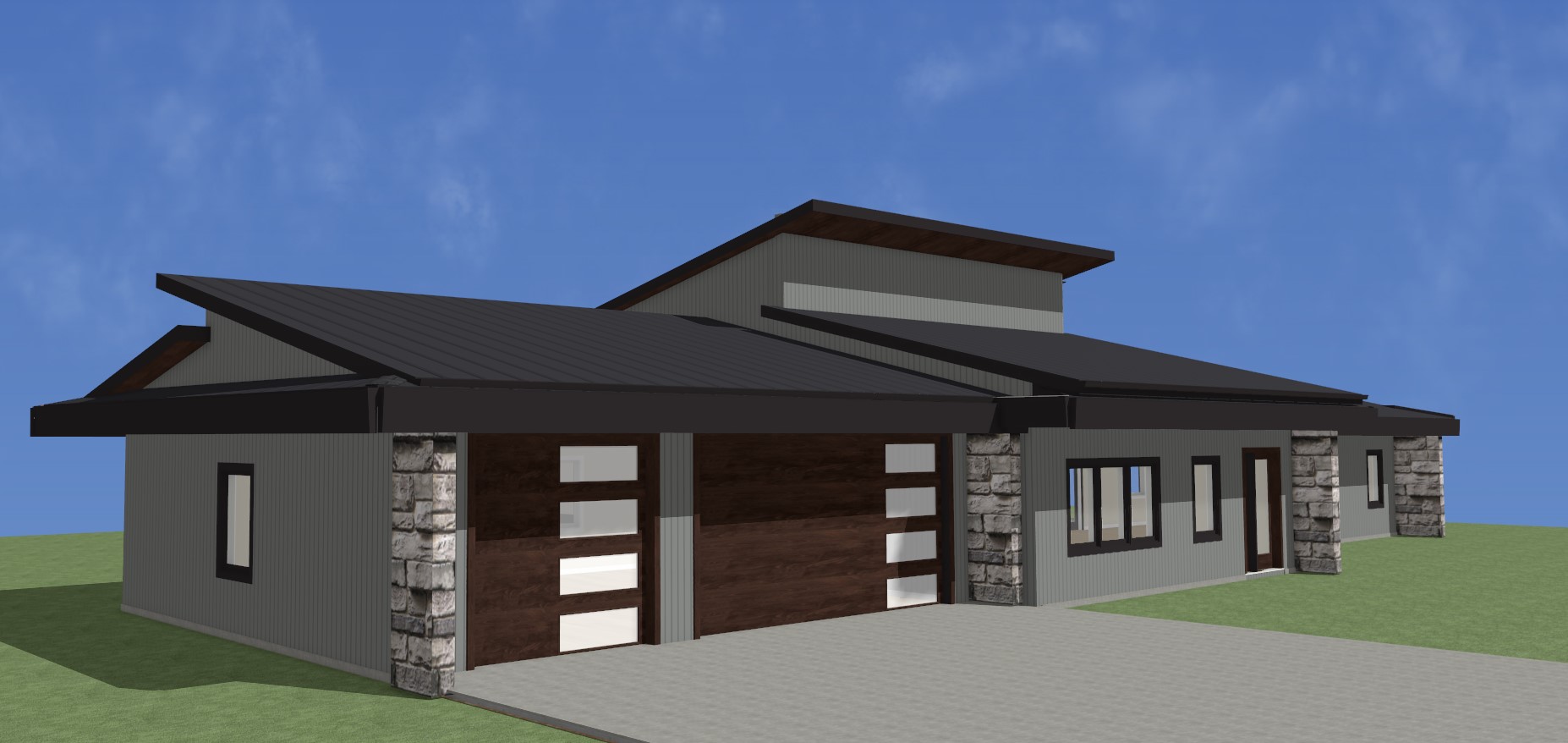 make this image a photograph of a exterior elevation the siding is vertical vinyl plank in a grey green color the garage doors are a wood grain to match the front door the soffit will match the garage door wood grain and make light landscaping and a tree out front on the right side of the cement driveway pad