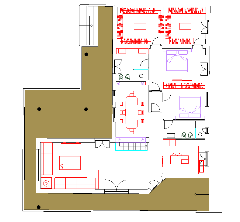 convert this floor plan into a realistic isometric 3d view of a full house show the space from an elevated angle with furniture walls and details visible usa colori molto tenui non usare stoffe colorate parquet interno a spina francese travertino nei bagni teak esterno sul terrazzo e parapetto scala in vetro la scala scende al piano interrato use the same furniture as shows on the plan do not change the orientation of the floorplan