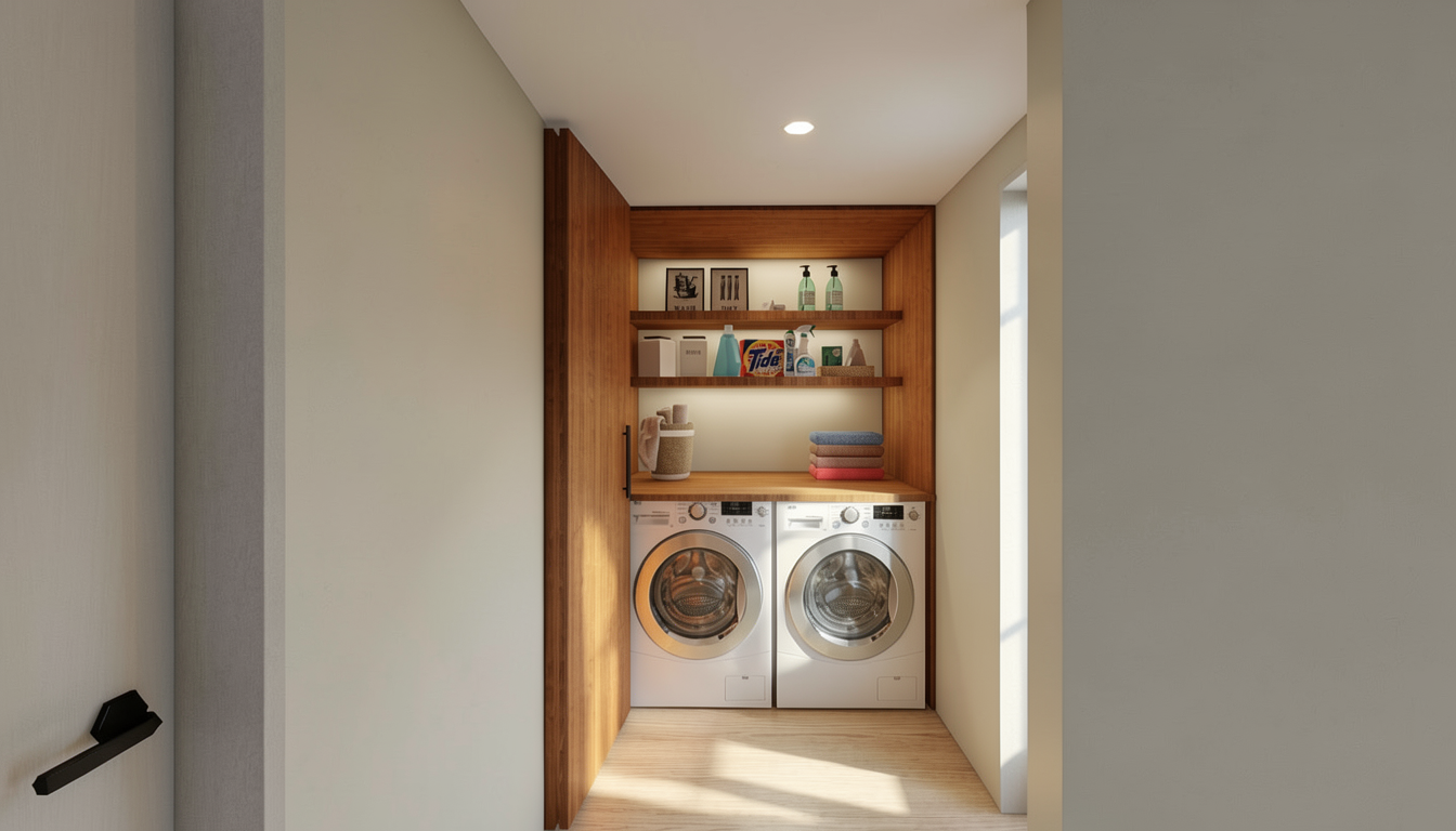 this laundry has a two panel folding door for this render show the folding door partially folded demonstrating how the folding mechanism works without fully closing the laundry keep one panel slightly folded inward revealing part of the laundry area maintain the original door handle visible and correctly positioned door should retain its wood texture grain and tone matching the surrounding cabinetry ensure the folding action looks natural with correct hinge behavior and realistic alignment do not distort proportions or change the structure of the door lighting preserve the natural light coming from the right side maintain soft ambient illumination and realistic shadow falloff around the partially folded door rendering goal photorealistic finish with high resolution textures natural shadows and true to life materials showing the folding door partially folded to demonstrate its function without altering the layout