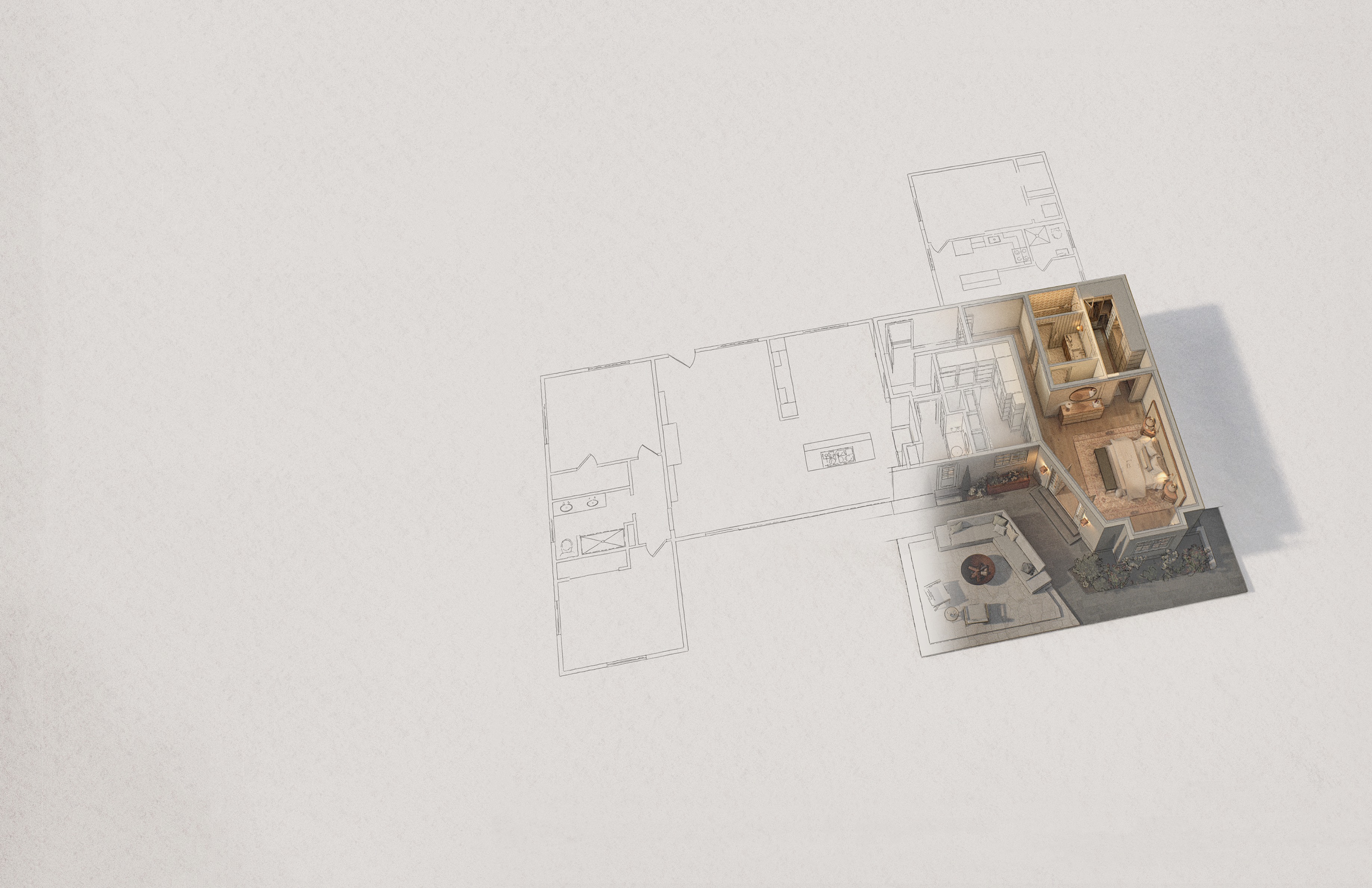 enhance this image to a refined architectural portfolio style while preserving the exact layout geometry and composition do not change any walls furniture materials or proportions focus on the following elevate the white background into a soft textured paper like surface subtle watercolor or fine grain add gentle realistic cloud shadows cast across the ground plane for depth improve the raised 3d portion with soft ambient lighting and natural global illumination ensure interior spaces within the rendered portion glow with warm realistic lighting lamps and indirect light visible through windows openings increase contrast between the flat plan linework and the raised rendered portion refine material realism slightly wood fabrics stone without altering colors or design add soft contact shadows beneath the 3d mass to ground it maintain a clean minimal high end presentation suitable for an interior design portfolio the result should feel atmospheric architectural and composed with a balance between diagrammatic plan and photoreal rendering do not redesign or reinterpret any elements
