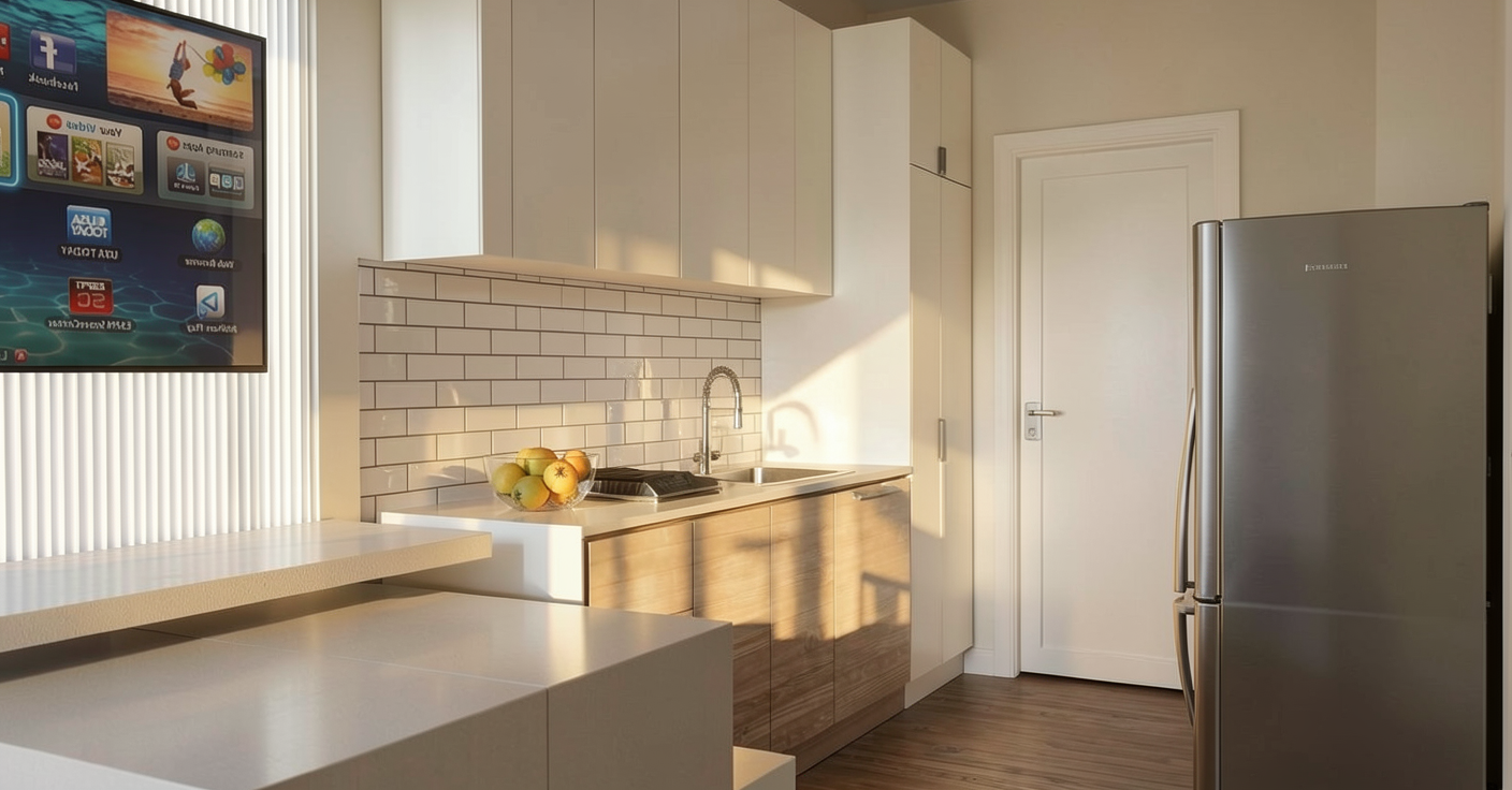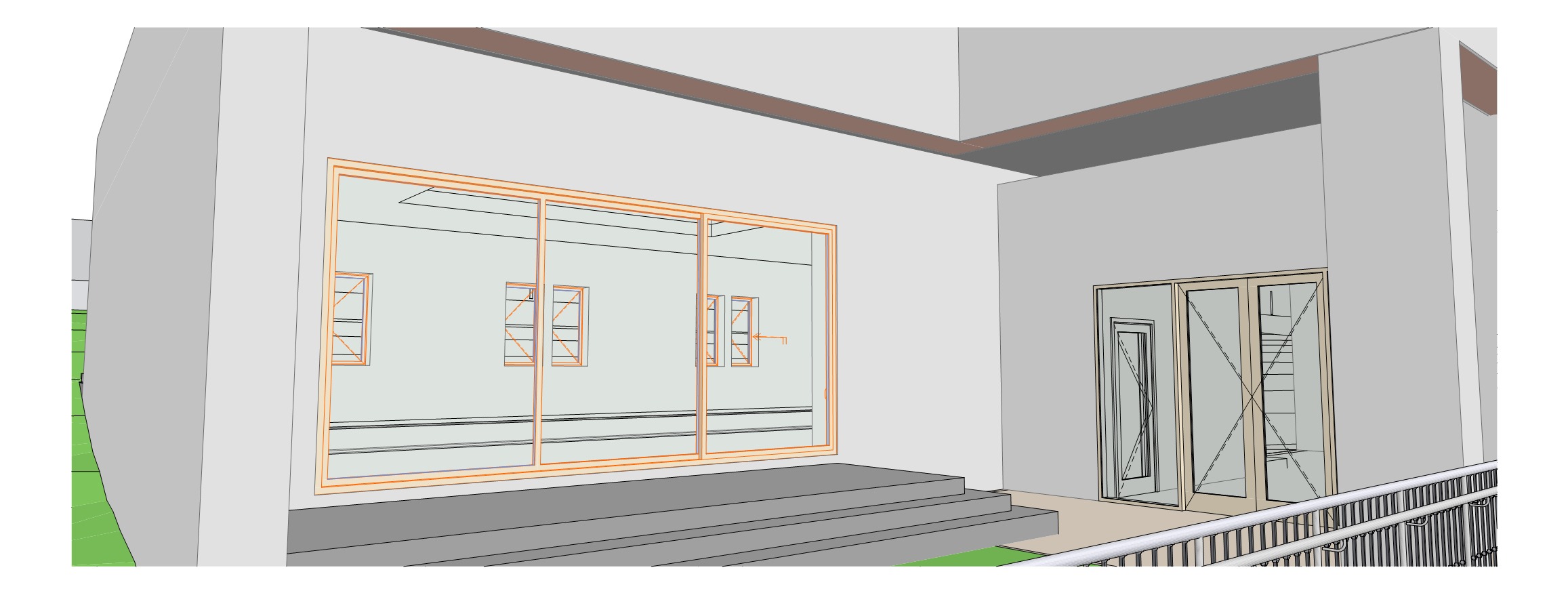 modern suburban house with sleek architecture a mix of beige and white exterior walls charcoal gray roof and light brown chimney large glass windows with wooden frames surrounding elements include a green lawn and a paved driveway the atmosphere is sunny and inviting with soft natural lighting
