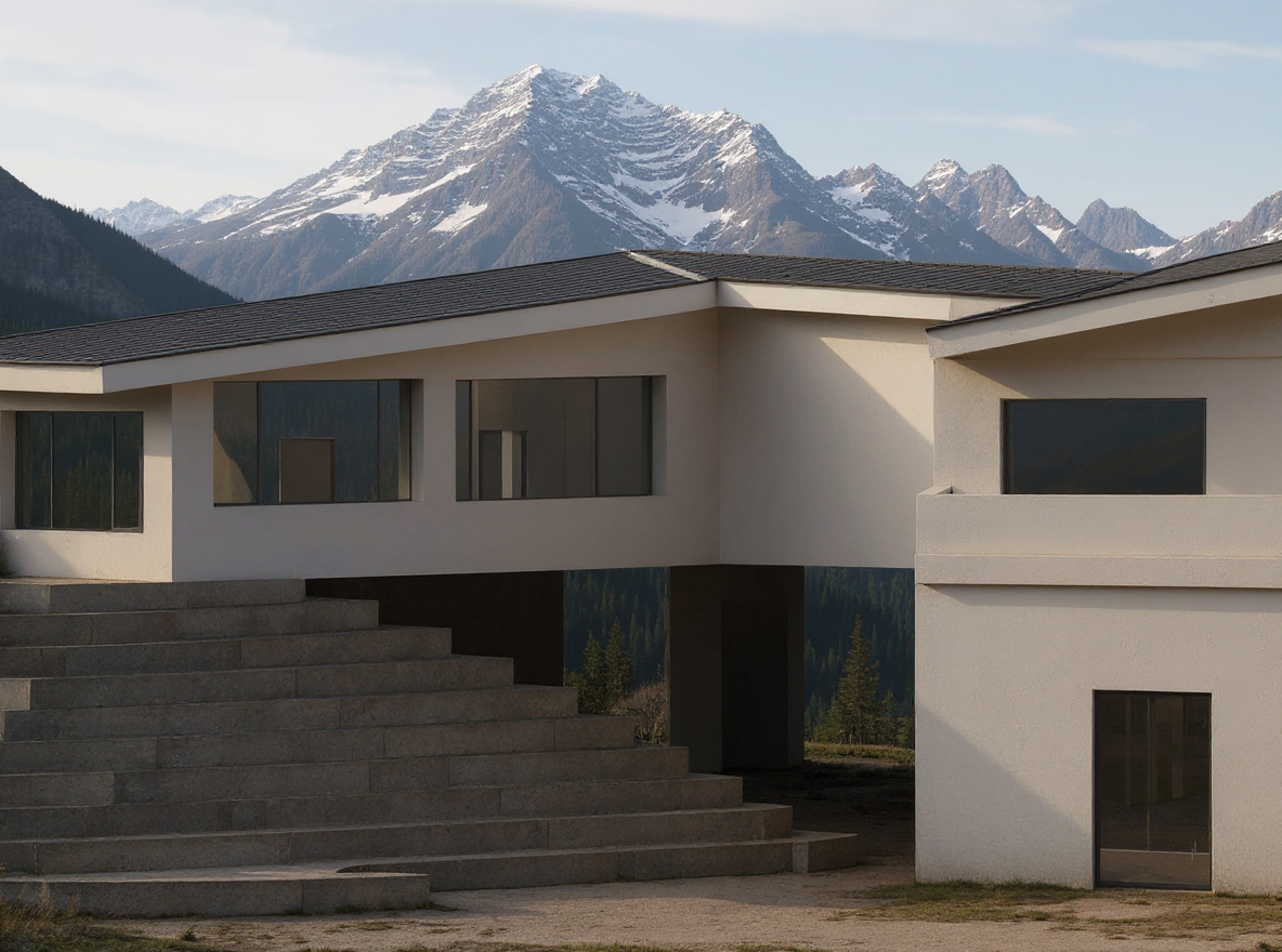 generate a photo realistic image from inside house with fireplace and dining table with surrounding windows that view the tall trees and mountains maintain a 3 2 aspect ratio for the image
