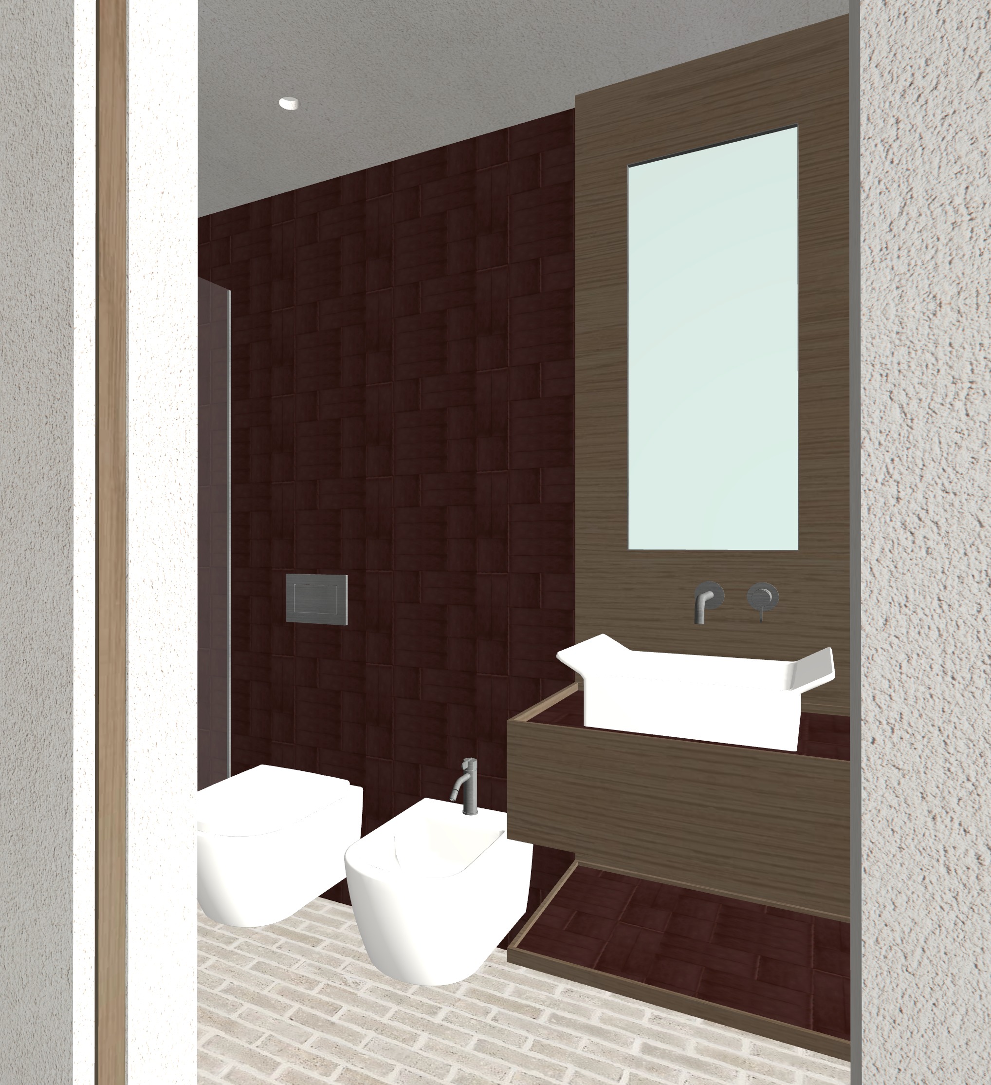 mantieni texture immagine boiserie frontale in legno rovere vena come immagine abbastanza chiaro piastrelle a sinistra colore bordeaux come immagine lucido non stonalizzato pavimento come texture immagine muro come intonaco esterno bianco strip led verticale a lato della boiserie che spara verso i sanitari specchio rettangolare ciotola in ceramica bianca lucida rubinetti in acciaio satinato sanitari in ceramica lucida specchio a tutta altezza sulla destra c un faretto anche in doccia mantieni texture pavimento anche nella mensola sotto il lavabo manteniamo le piastrelle sulla parte superiore