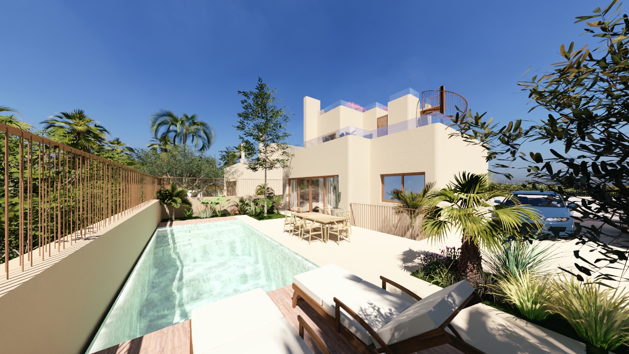 mejora de imagen de exterior ajustando principalmente el clima y la iluminaci n manteniendo intactos todos los elementos originales de la escena sin modificar arquitectura ni a adir mobiliario o vegetaci n aplicar un ambiente mediterr neo con luz solar c lida natural y equilibrada cielo parcialmente nublado con nubes suaves que aporten profundidad y realismo generar sombras definidas pero agradables coherentes con la posici n del sol optimizar la exposici n el contraste y el rango din mico para conseguir una imagen luminosa y clara sin sobreexposici n mejorar la calidad de la luz sobre las superficies resaltando vol menes y materiales existentes mediante iluminaci n realista a adir de forma sutil un gato en la escena integrado de manera natural en el entorno urbano con proporciones realistas y sin restar protagonismo a la arquitectura aumentar la nitidez y el realismo general manteniendo colores naturales ligeramente c lidos estilo de fotograf a arquitect nica profesional alta calidad fotorrealista sensaci n de d a agradable y luminoso no quiero nubes