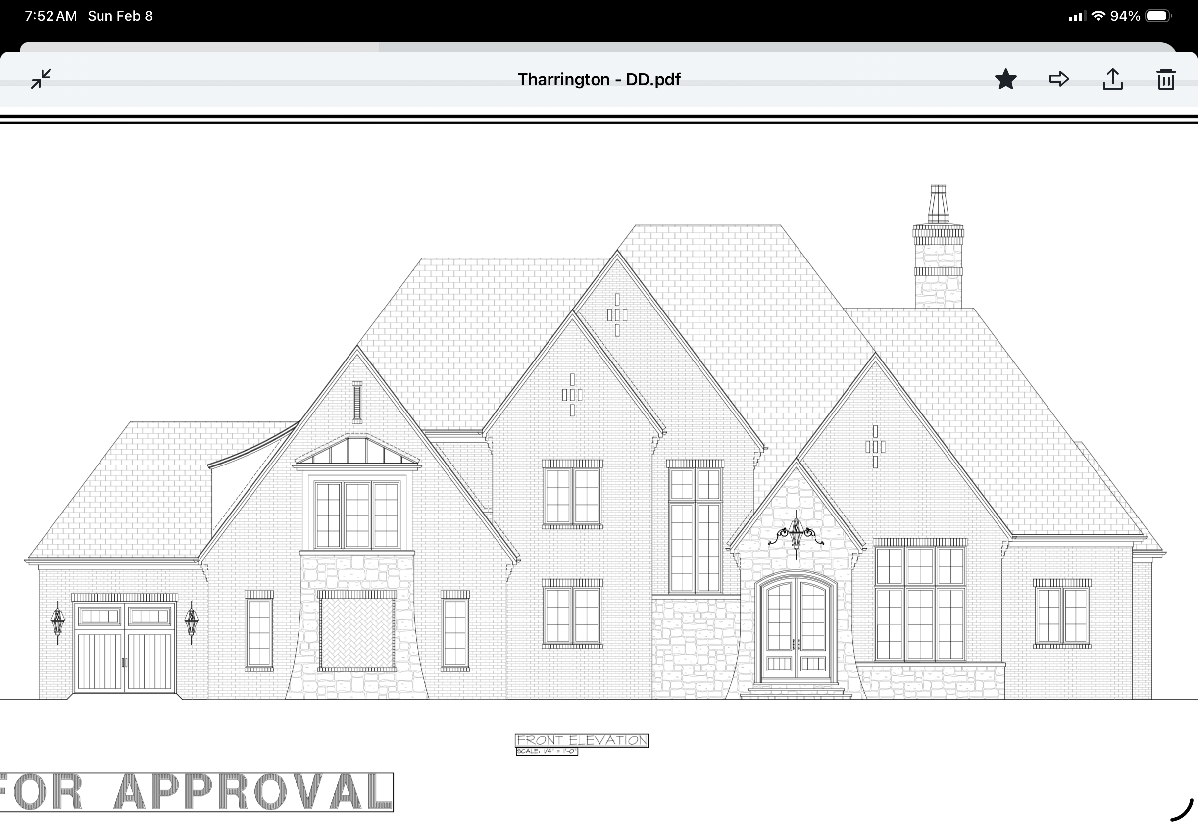 englishcountry design slate gray roof black windows and eaves beige brick lush landscaping vibrant blue sky in and out drive slight view from the right keep all details as is show entire structures and add small fountain