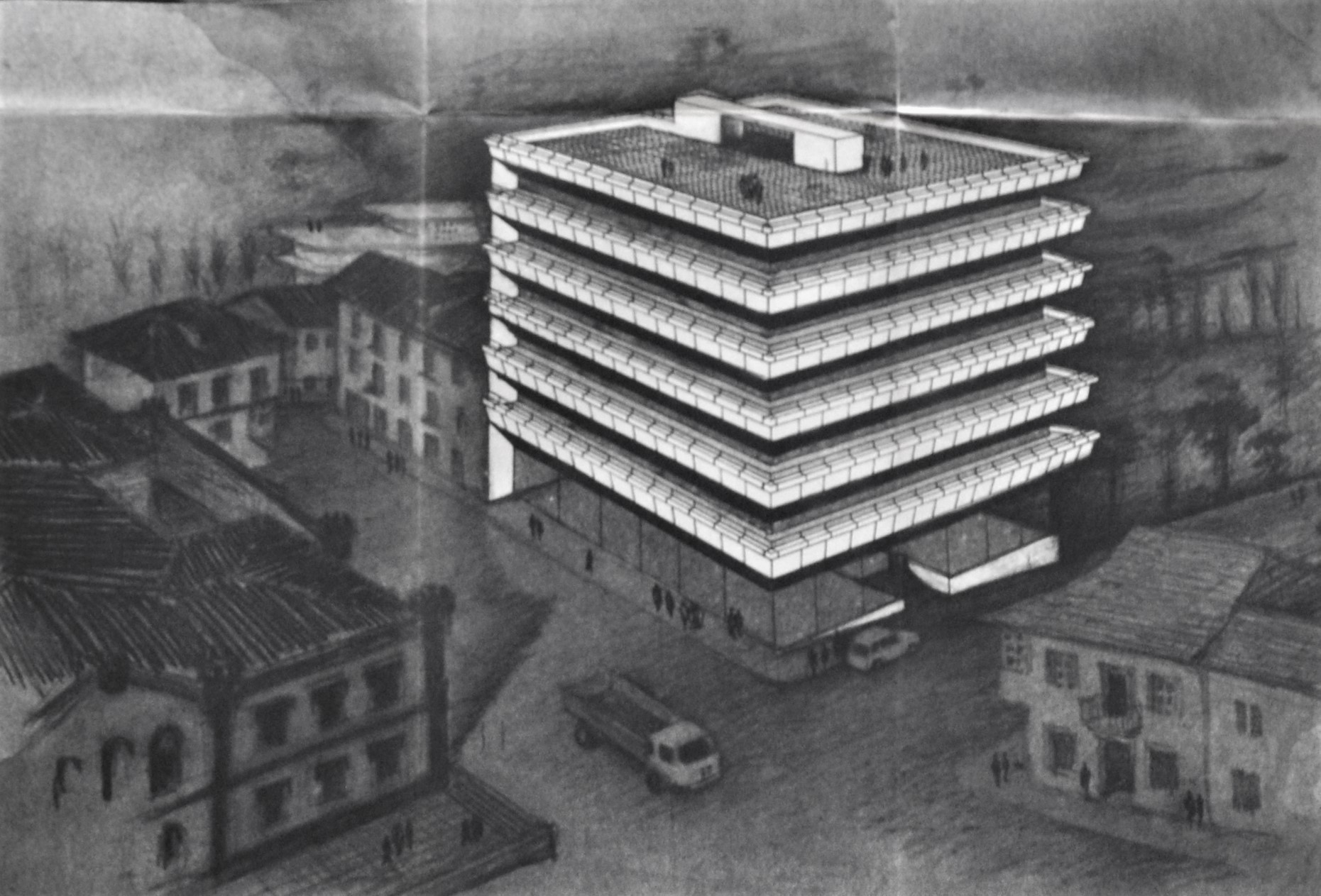 edificio de viviendas que en todas las plantas tiene una serie de m dulos que se repiten cada m dulo tiene una jardinera en la parte superior y un vidrio ligeramente inclinado hacia el interior de color naranja intenso la planta baja y los paramentos interiores son de vidrio transparente con carpinter a negra est situado en una zona urbana