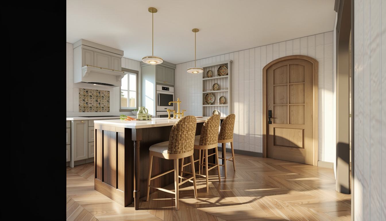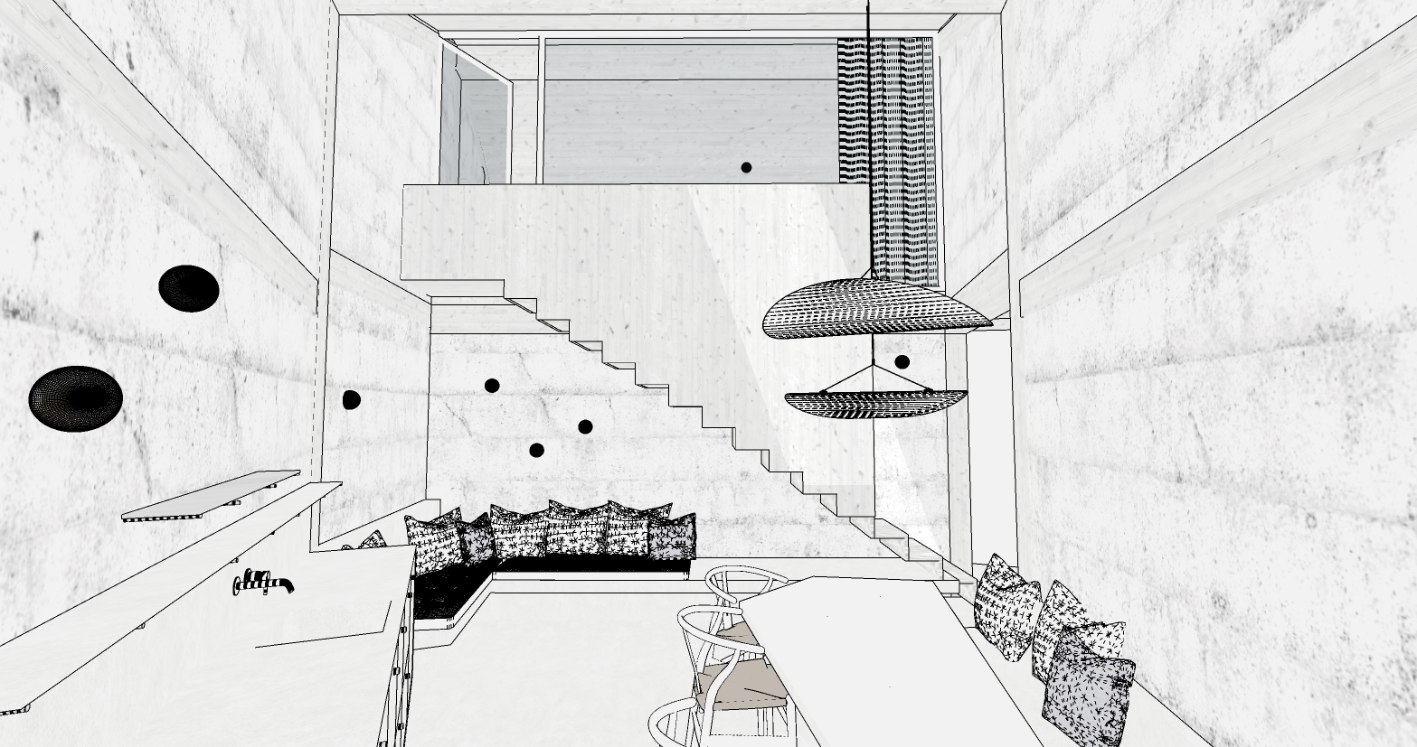 soft textures light wood light grey beton metalic kitchen the floor is light microcement incuding the benches and and the pillows are white linen style atelier holcnerova