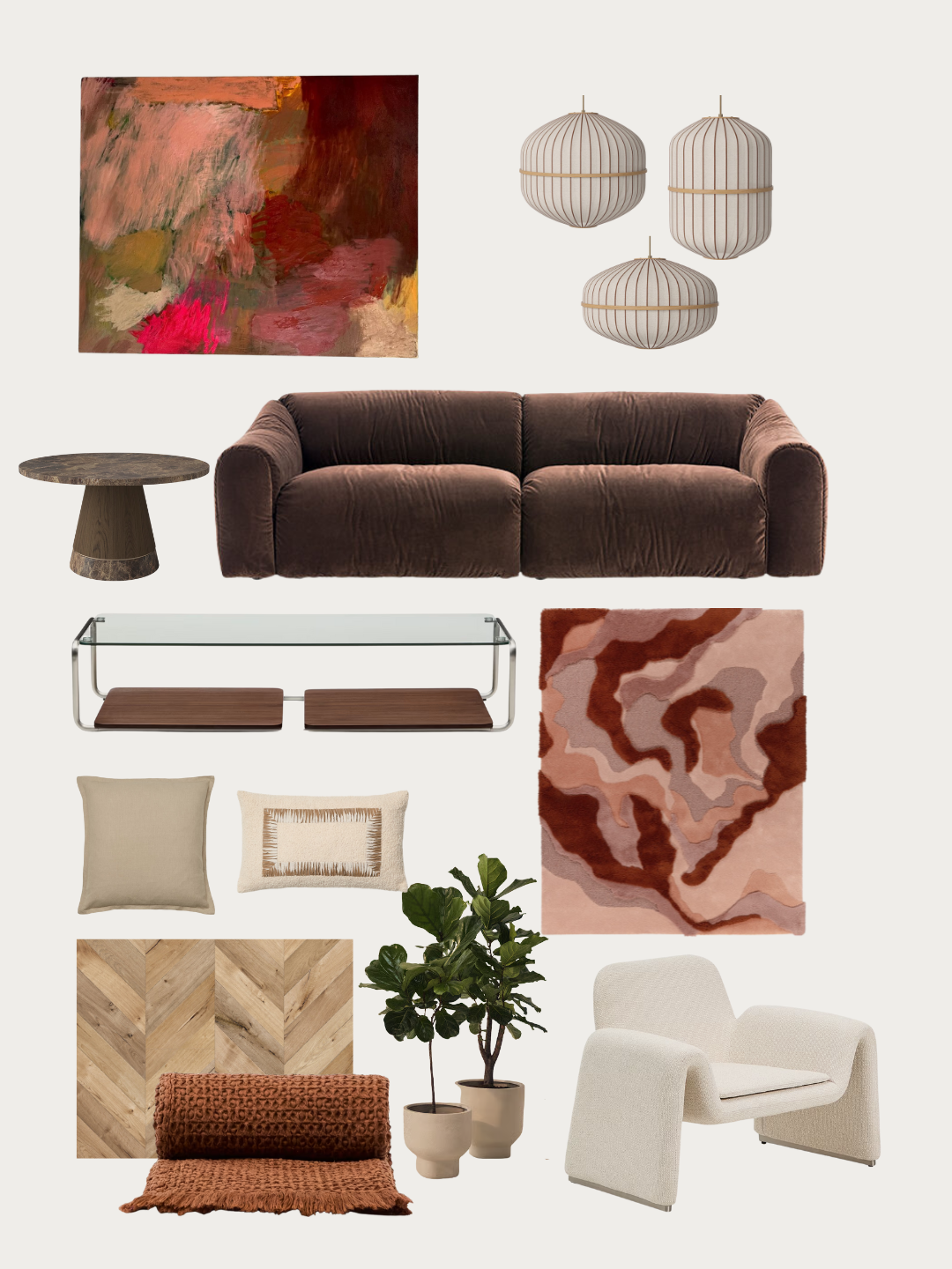 create a realistic modern living room interior inspired by the updated moodboard with a warm artistic and tactile atmosphere the space has 3 meter high ceilings off white walls with simple baseboards and a large panoramic window on the left filling the room with soft natural daylight the view is from a corner perspective showing the entire composition at the center feature a dark brown velvet sofa with a low plush form as the main focal point in front place a rectangular glass coffee table with a metal frame and two walnut shelves perfectly aligned parallel to the sofa to the right include a sculptural white boucle armchair with soft rounded lines for visual contrast lay a large 3 x 3 meter abstract rug in blush rust and rose tones under the full seating area to unify the space on the wall behind the sofa hang a large expressive abstract painting in warm reds pinks ochres and soft greens introducing artistic depth and emotion above the seating zone suspend three pendant lights with white linen shades and thin wooden ribs in varying diameters from 60 to 90 cm arranged at different heights for rhythm and balance by the window add two fiddle leaf fig plants up to 2 meters tall in matte cream ceramic pots introducing organic height and texture on the glass coffee table place terracotta colored books and a small decorative object or vase for warmth and layering fold a chunky terracotta knit throw on the arm of the sofa or casually over the armchair to add softness the flooring is natural oak in a herringbone pattern grounding the palette in organic texture the windows are framed with floor length beige linen curtains diffusing the daylight with a soft warm glow the overall atmosphere is modern minimalistic yet expressive blending earthy tones natural materials and art inspired color accents to create a space that feels inviting grounded and quietly bold