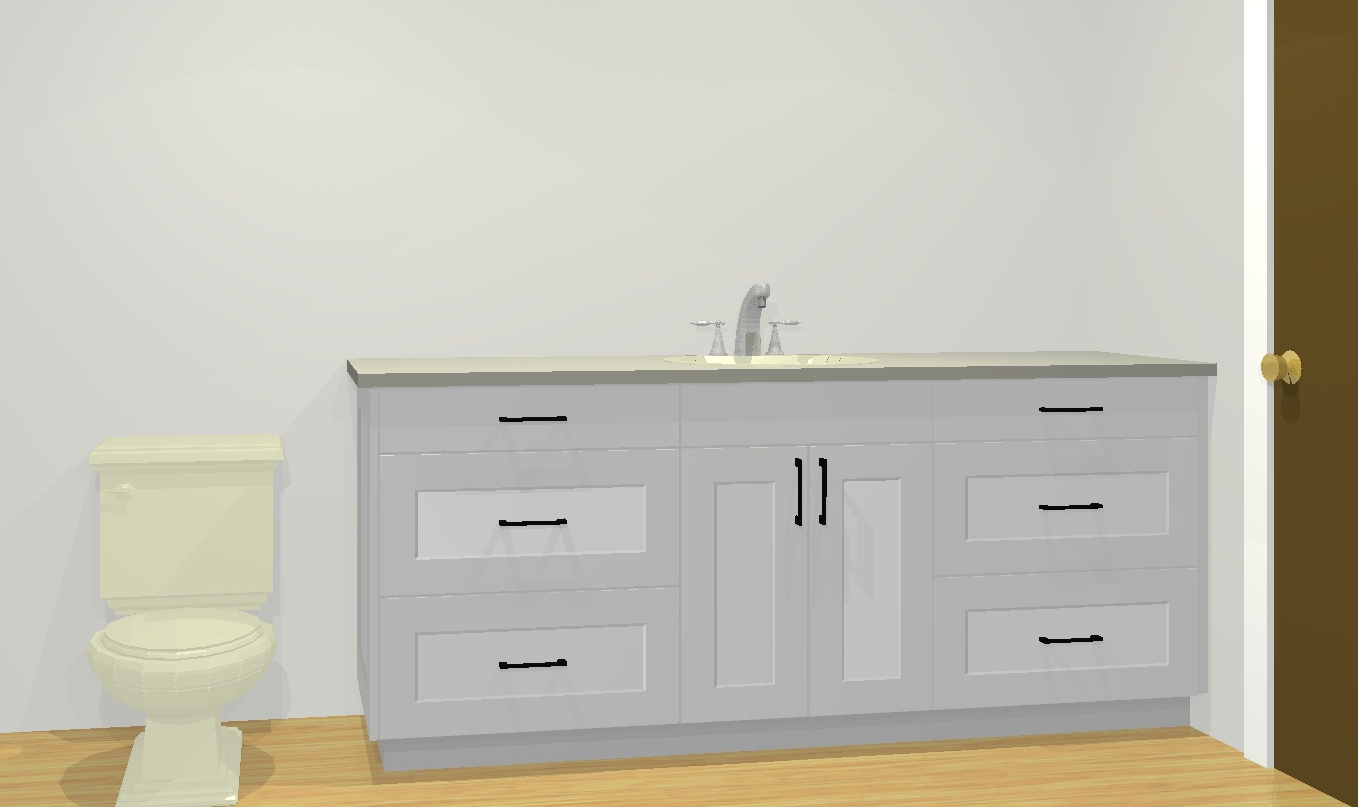a minimalist bathroom scene featuring a medium brown knotty alder wire brushed vanity with dark metal handles set against a slightly off white wall to create a modern and clean atmosphere the countertop is a soft cream color with a gleaming silver faucet at the center adjacent to the vanity a classic light beige toilet complements the aesthetic the room has a warm natural wood floor adding a touch of coziness a rich brown wooden door with a satin nickel knob contrasts subtly with the neutral tones enhancing the elegance of this serene space soft diffused lighting creates a calm and inviting ambiance