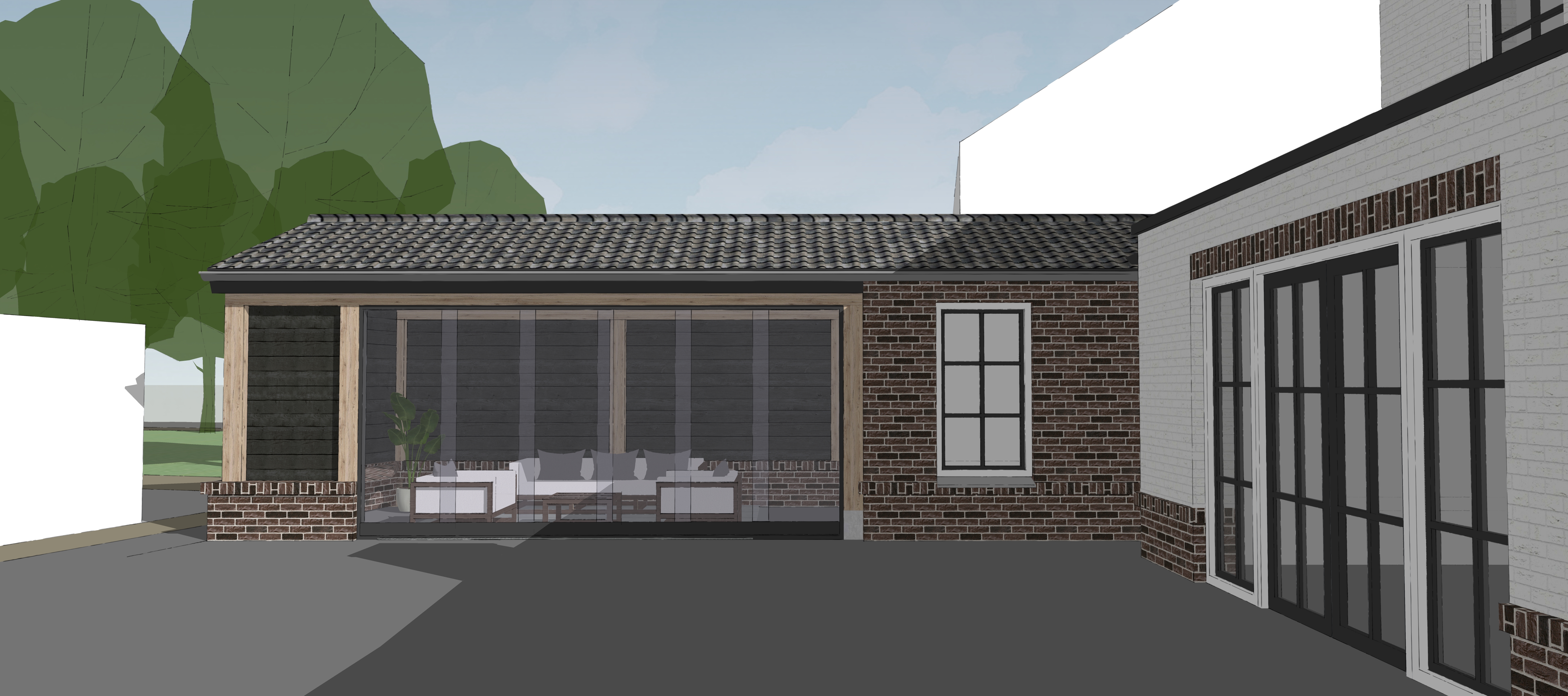 add modern garden with some grass and a wooden fence on the left side replace concrete for tiles