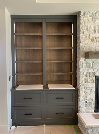 do not change the cabinets in any way preserve the exact cabinet colors materials finishes dimensions door and drawer styles hardware spacing alignment and all geometry exactly as shown do not alter the countertop shape backsplash appliances flooring lighting fixtures or wall structure only remove the construction materials clutter and mess from the scene clean the room and make it look finished and staged add a few simple tasteful home accessories appropriate for the style of the space but do not add or remove any furniture windows or architectural elements maintain the original lighting direction and realism enhance clarity and polish the photo while keeping the cabinetry and room design completely unchanged do not alter the lighting to keep the cabinet colors as they are in the image remove the white boards on the countertop stage the shelves for a simplistic modern living room