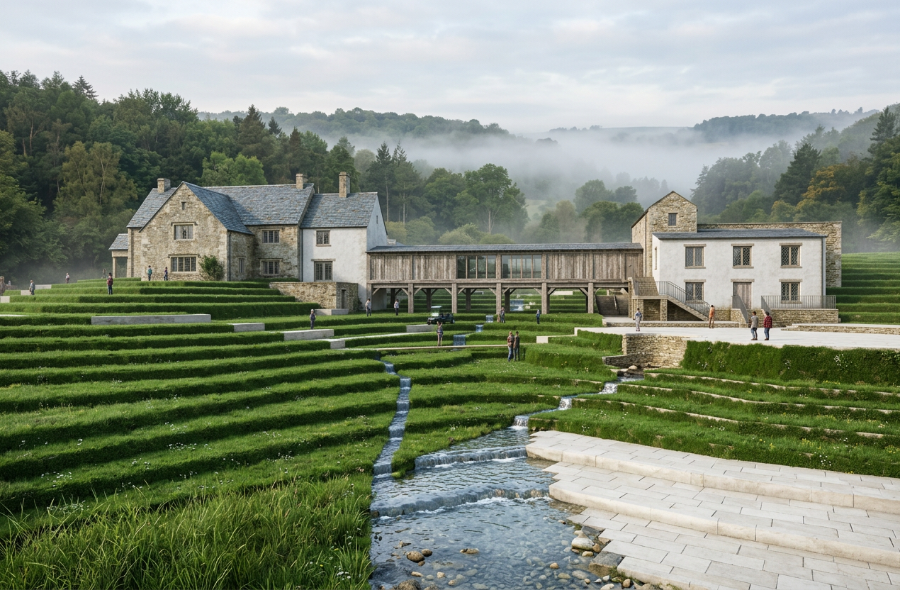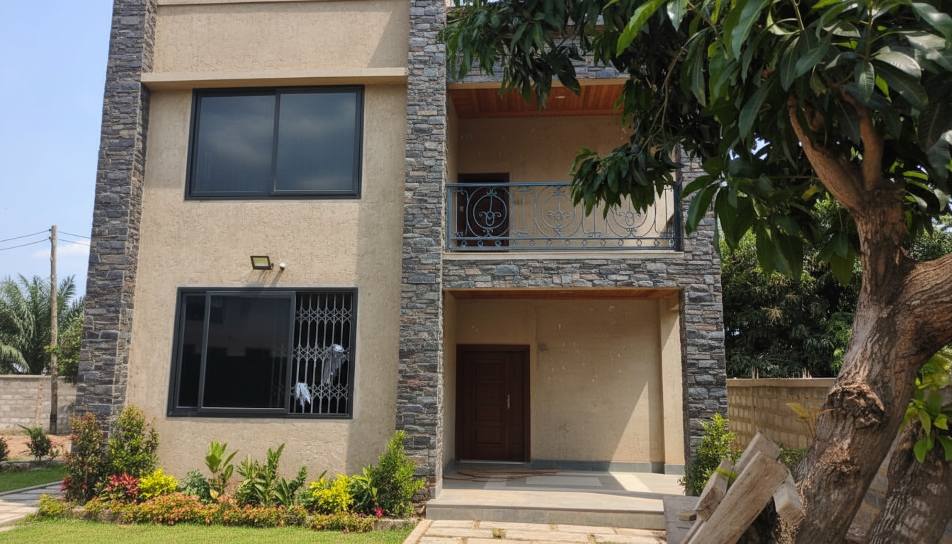 modernist exterior shot a beautifully rendered image of a two story unfinished building with a rustic charm the walls are textured in a warm sandy beige with a soft and subtle weathered look the windows have sleek dark frames that reflect a deep charcoal gray giving a modern contrast the balcony is adorned with intricate art nouveau style wrought iron in elegant red the lush tree on the right has vibrant green leaves with a touch of sunlight filtering through casting dappled shadows the atmosphere is serene and inviting with a clear blue sky and gentle natural lighting that highlights the structure s details and the surrounding greenery architecture