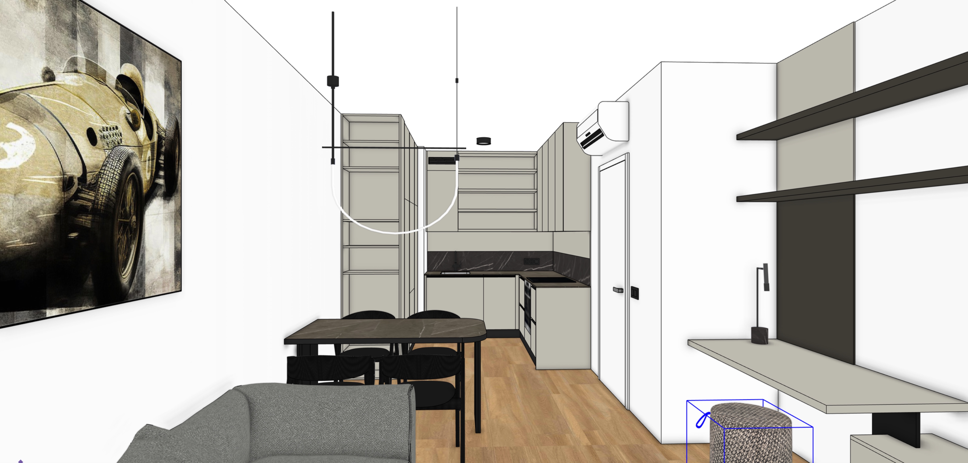 photorealistic interior render of a compact modern living room with kitchen based strictly on the provided 3d model do not change geometry layout proportions furniture placement or architectural details materials natural european oak plank flooring with subtle grain and satin finish kitchen cabinets in grey beige matte lacquer work desk and wall panels in dark brown and grey beige matte surfaces kitchen countertop and dining table in matte brownish marble with soft veining minimal dining chairs on black wood dark marble tabletop textured grey fabric sofa minimalist shelving with matte finishes lighting soft north east daylight entering from unseen windows balanced interior exposure realistic global illumination warm bounce from oak flooring soft ambient occlusion in corners subtle contact shadows camera eye level interior photography 35mm lens horizontal composition balanced perspective architectural photography style rendering quality ultra realistic materials micro surface texture accurate reflections physically based rendering cinematic dynamic range no overexposure no distortion high end interior visualization