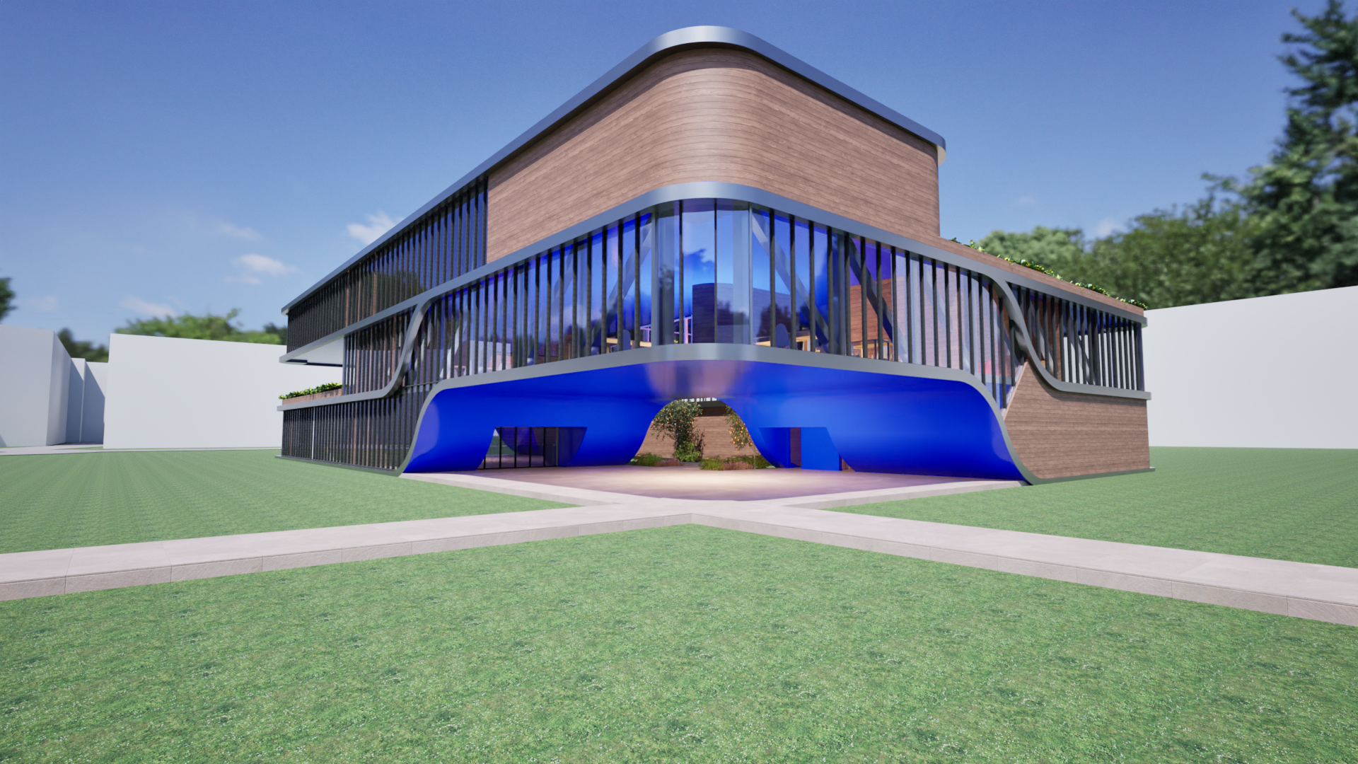 an architectural visualization of the existing office building maintaining its exact geometry facade and materials without any modifications the entire landscape surrounding the building is completely transformed the current lawn area is replaced by detailed curated garden beds with diverse plants elegant shrubs and perennials several mature trees are added and integrated into the design the landscape features modern outdoor furniture including contemporary public benches and designer planters photorealistic figures of professionals are depicted within the new garden spaces walking and interacting naturally the lighting is bright daylight highlighting the distinction between the preserved building and the new vibrant landscape