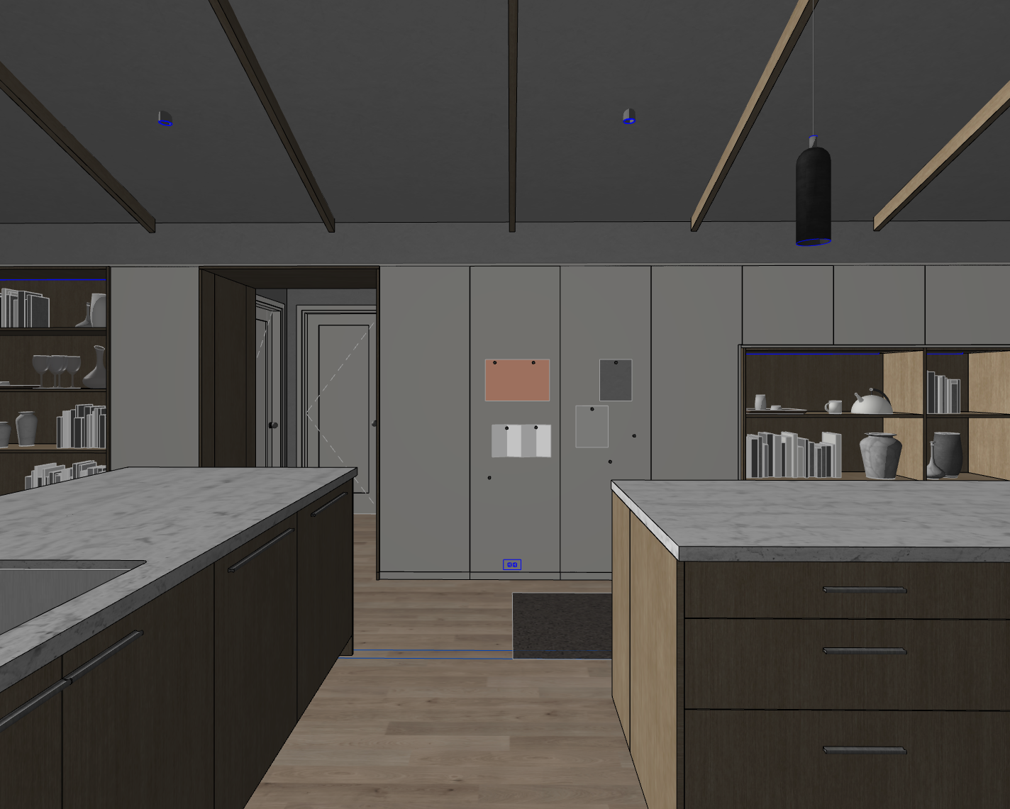 render this kitchen in a warm contemporary manner with interior lighting fixtures turned on to a subtle warm glow the countertop should be a subtle travertine brighten the drywall walls and ceilings apply a contemporary medium dark toned plain sawn oak to the cabinetry with a white oak flooring the wood ceiling beams and wood window frames should match the cabinetry utilize a low pile warm brown for the rugs on the floor add a subtle warm glow from the shelves without showing the source fixture