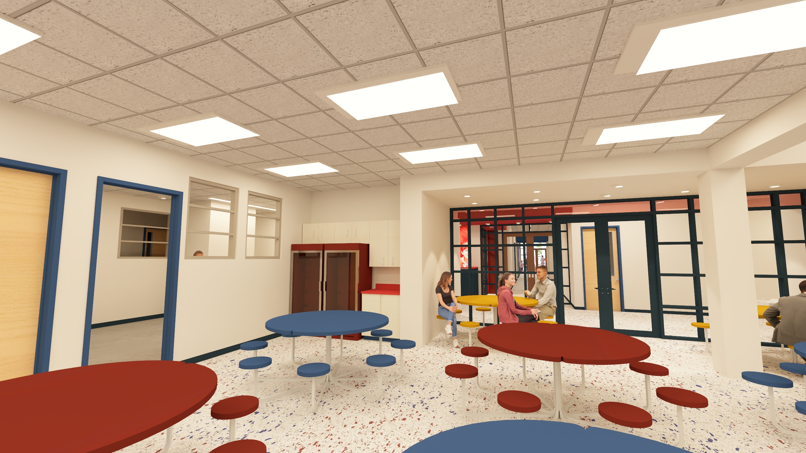 add children in blue uniforms having lunch allign lighting with ceiling grid