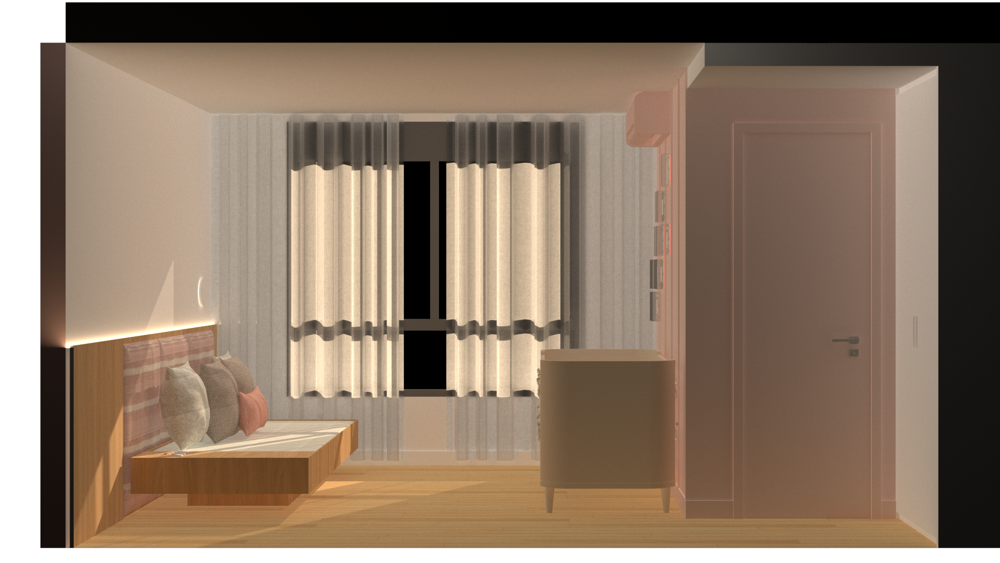 a photorealistic render of the same interior keep all elements exactly as shown the floor is made of tauari wood strips the armchair is upholstered in light pink velvet the left wall the wood slats the baseboard and the air conditioning unit are all painted in light pink the remaining walls are white the changing pad on top of the dresser has the same fabric as shown in the image but in a light rose tone the flower shaped wall structure is also light pink with a circular mirror in the center the bookshelf keeps like the image the floor lamp has a pleated paper lampshade on the bed the pillows closest to the headboard are white knit the middle ones match the changing pad fabric and the front pillow is light pink velvet add realistic lighting soft shadows high quality materials and textures and natural finishes without changing the layout design or decoration please revise the image to improve both the flooring and the overall atmosphere without changing the architecture or adding any new windows the current wood floor looks too rustic replace it with tauari wood flooring smooth elegant light wood strips with subtle grain and a clean refined finish all wooden furniture elements such as the bed wall panel and dresser should be in american oak wood with its natural warm tone and subtle grain pattern the image appears too dark and flat add more natural looking light but only through the existing lighting conditions do not add any new windows or openings simulate soft daylight entering from the original direction with warm diffused tones adjust the filter to feel cozy welcoming and softly lit enhancing the natural materials and calm color palette the final result should feel serene minimalistic and inviting with realistic lighting and a warm gentle mood