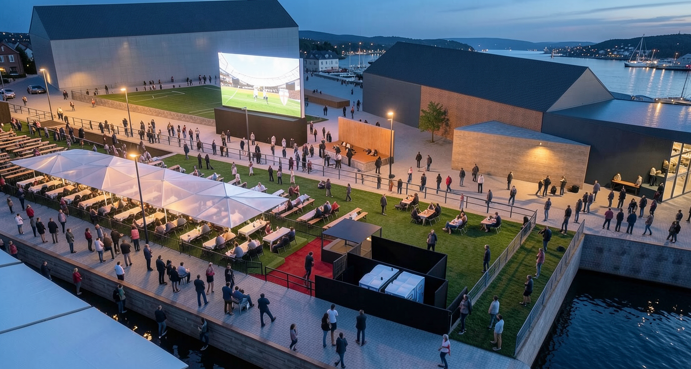 photorealistic architectural visualization of the provided sketchup model absolute geometry lock critical do not add any new platforms decks levels surfaces or structures do not extend raise lower or modify any floor surfaces do not create any new wooden decking areas keep exact ground surfaces heights edges and borders from the original sketchup model do not modify seating platform geometry no new 3d deck elements anywhere absolute rules do not change geometry do not move resize rotate or replace any object do not add or remove anything maintain exact layout distances and proportions maintain original camera angle and composition no people material locks only apply realistic textures to existing surfaces wood texture only where wood already exists in original model concrete texture only where concrete exists no new material zones scene goal transform the sketchup model into a premium vibrant outdoor football fan zone with strong atmosphere without adding objects or redesigning atmosphere life very important create a lively warm welcoming festival atmosphere use lighting contrast reflections and material richness to create energy subtle glow from led screen warm light spill from vip tent soft ambient reflections on water balanced contrast between warm and cool tones scandinavian summer evening vibe lighting golden hour early blue hour transition soft warm highlights subtle cinematic contrast no added lamps no decorative light strings no extra fixtures render style ultra realistic cinematic but natural premium architectural visualization high end event visualization sharp focus realistic shadows realistic reflections no stylization no fantasy look negative prompt oppdatert new decking extra platforms raised floors new surfaces stage redesign geometry changes new lighting fixtures decorative lights string lights people crowd flags banners vegetation football field lines soccer pitch grass texture added structures layout changes