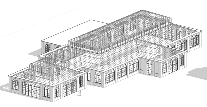 aerial shot victorian botanical gardens and conservatory with stone walls white mullions and clear glass place on a large formal victorian garden