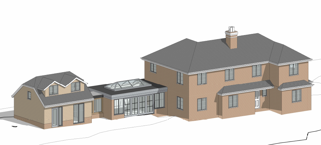 create ultrarealistic render cladding to be oak weatherboard brickwork to be red ish face brick roof tiles are slates fascias and windows to be light grey