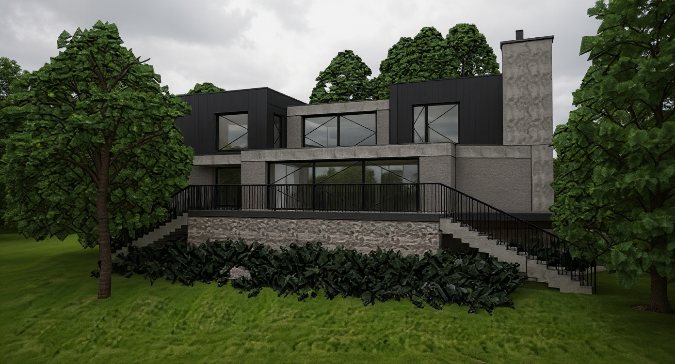 white plaster cladding with black weatherboard features black roof black window frames lawn low timber decks extensive native planting background trees sunset