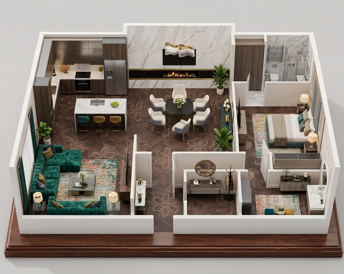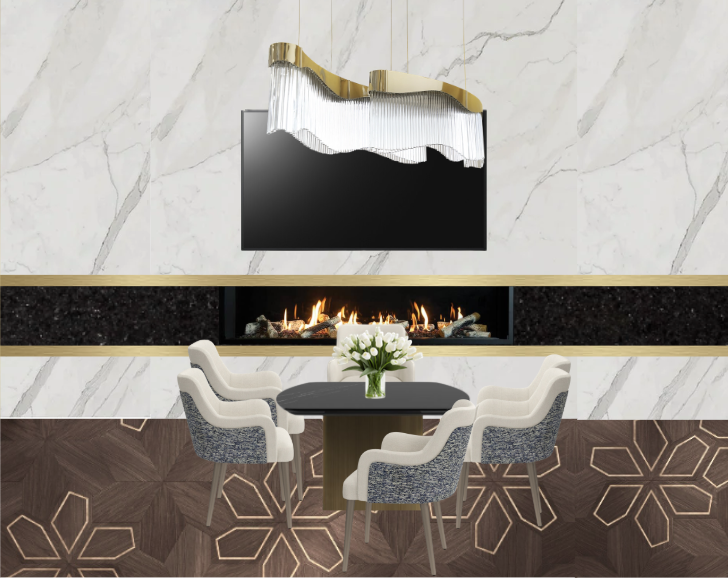 hyper realistic modern luxury interior featuring a full height marble feature wall in soft white and light gray tones with delicate natural veining centered on the wall is a sculptural statement chandelier with layered white glass elements and brushed gold accents fully supported with visible suspension cables and ceiling canopy for realism directly below the fixture a sleek black flat screen tv is mounted flush to the wall beneath the tv a contemporary linear fireplace is seamlessly integrated into the wall framed with a subtle black tiled border emitting a warm natural flame glow in the foreground place a rectangular black dining table to fit 6 chairs with a smooth matte finish styled with a fresh arrangement of white tulips in a minimal vase surround the table with six elegant dining chairs featuring cream upholstered seats and textured gray backrests with refined modern silhouettes flooring is dark brown wood with a geometric pattern slightly reflective adding depth and richness to the space lighting is soft and balanced warm ambient glow from the fireplace subtle golden illumination from the chandelier natural daylight softly filling the space creating gentle shadows and realistic highlights enhance material realism high detail marble texture with visible veining variation soft fabric grain on chairs realistic wood grain and slight sheen on flooring subtle reflections on black surfaces and metal accents camera eye level perspective slightly angled toward the feature wall capturing depth and composition no distortion cinematic framing style ultra realistic high end residential interior luxury clean composition no clutter