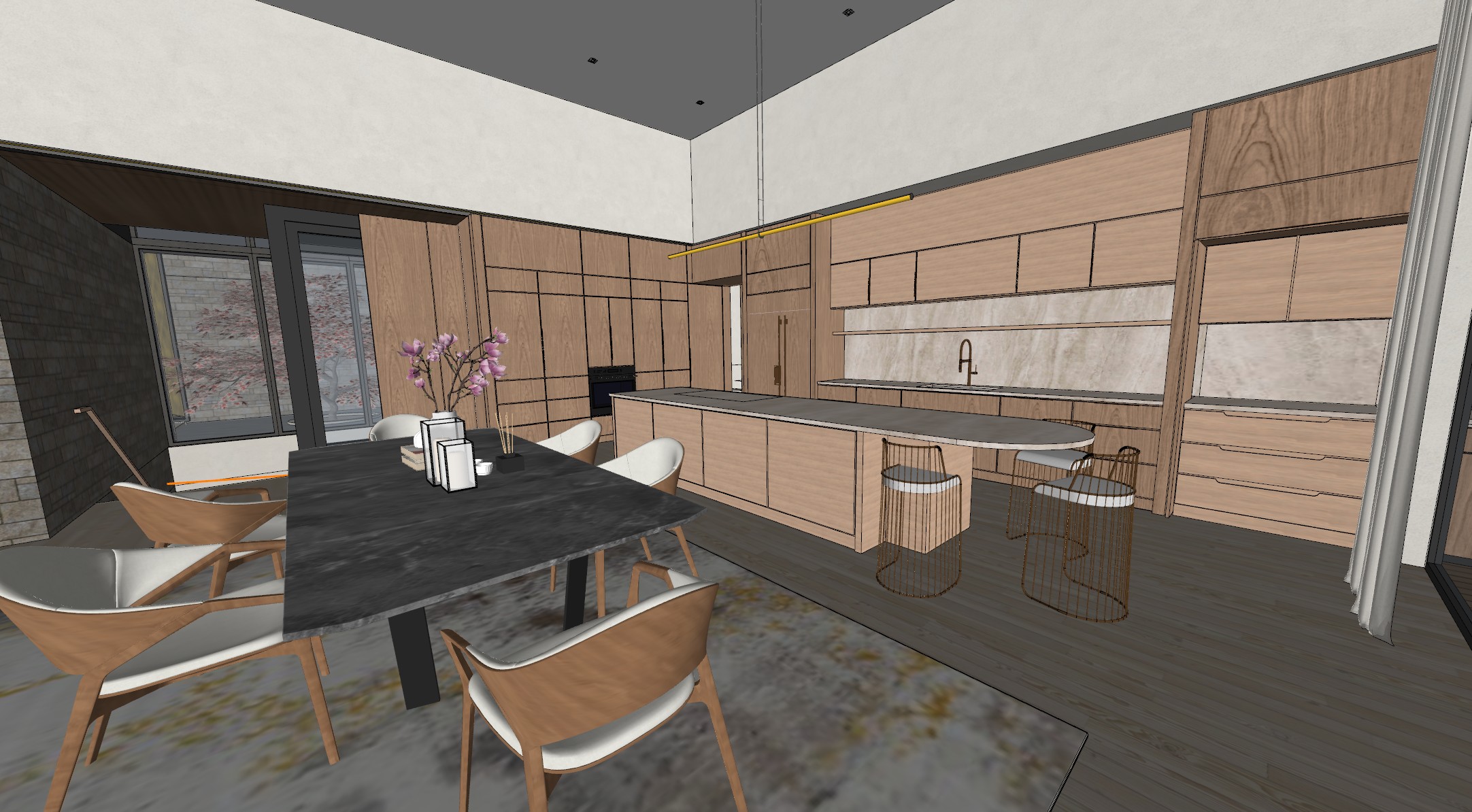 make kitchen look realistic dont change architecture behind the window make wood floor more taupe color