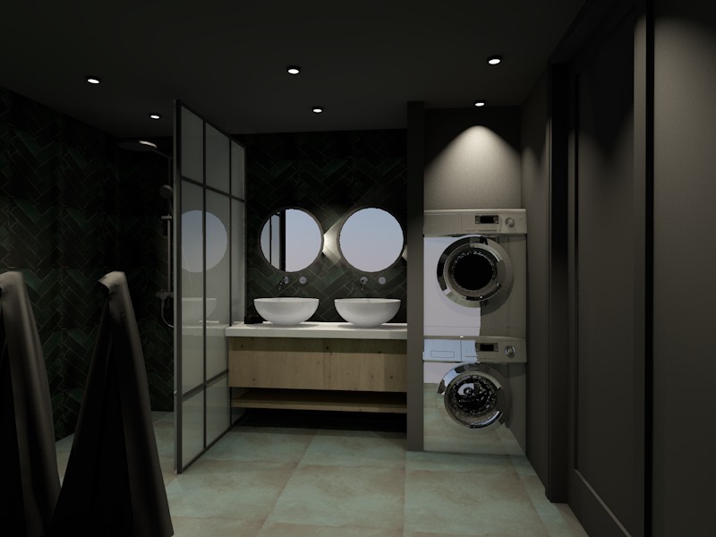 modern interior shot render a modern elegant bathroom with a freestanding white bathtub as the focal point create a calm space with soft lights use a dark brown color for the walls to add depth and choose a warm natural wood tone for the floor the ceiling should be a subtle light gray to complement the overall atmosphere gold details enhance the mood with soft shadows and highlights reflecting a calm and sophisticated atmosphere architecture